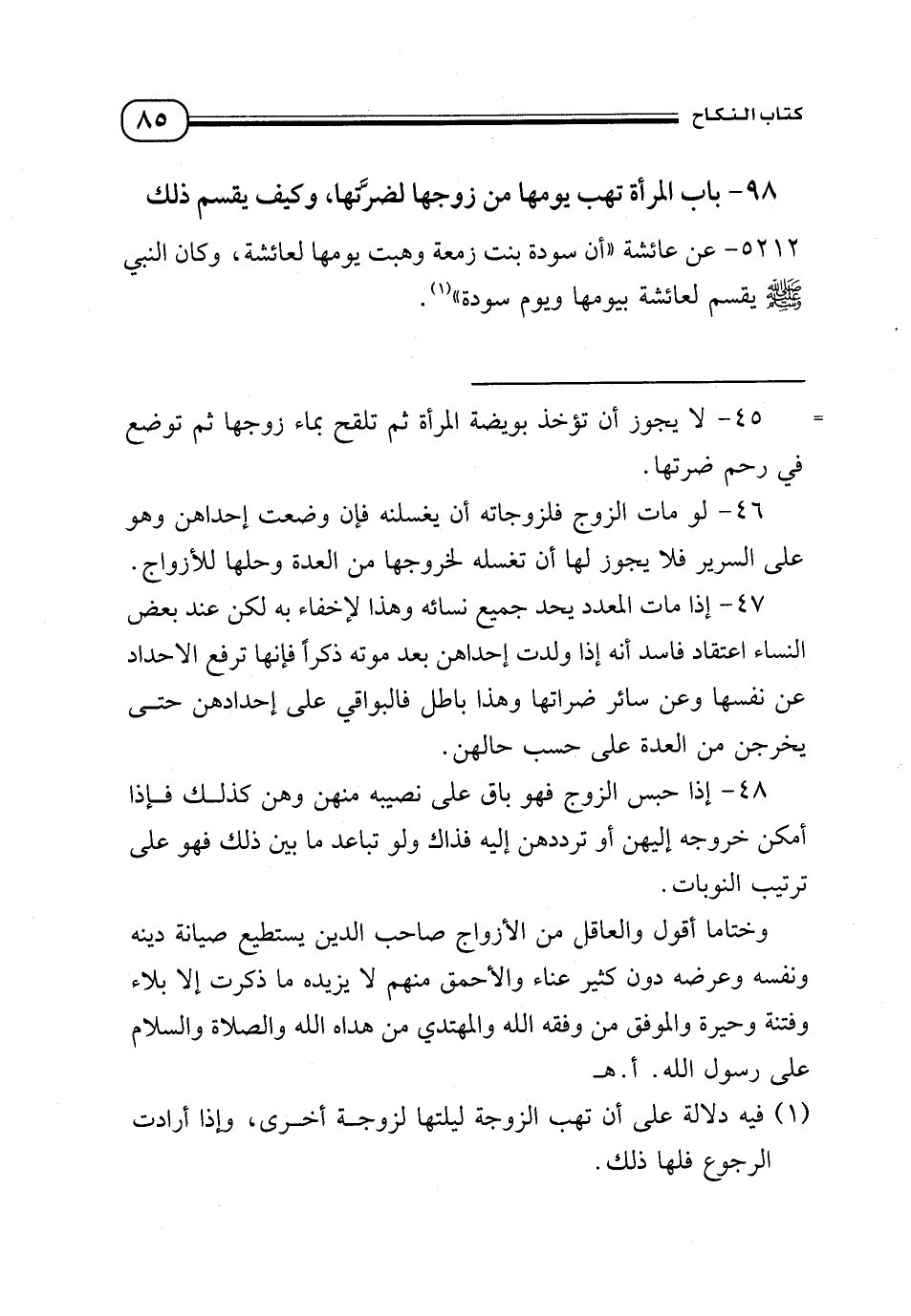 47 - إذا مات المعدد يحد جميع نسائه وهذا لإخفاء به لكن عند بعض النساء اعتقاد فاسد أنه إذا ولدت إحداهن بعد موته ولدا فإنها ترفع الإحداد عن نفسها وعن سائر ضراتها وهذا باطل فالبواقي على أحد ادهن حتى يخرجن من العدة على حسب حالهن.