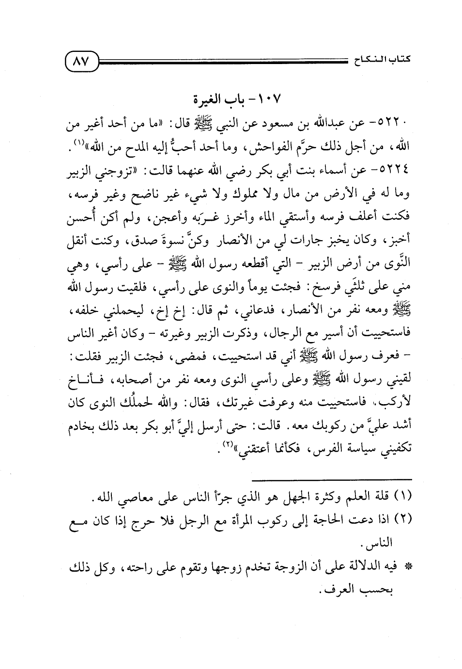 5224 - عن أسماء بنت أبي بكر - رضي الله عنهما - قالت: «تزوجني الزبير وما له في الأرض من مال ولا مملوك ولا شيء غير ناضح وغير فرسه، فكنت أعلف فرسه وأستقي الماء وأخرز غرَبه وأعجن، ولم أكن أُحسن أخبز، وكان يخبز جارات لي من الأنصار وكنَّ نسوة صدق، وكنت أنقل النَّوى من أرض الزبير - التي أقطعه رسول الله - صلى الله عليه وسلم - على رأسي، وهي مني على ثلثَي فرسخ: فجئت يومًا والنوى على رأسي، فلقيت رسول الله - صلى الله عليه وسلم - ومعه نفر من الأنصار، فدعاني، ثم قال: إخ إخ، ليحملني خلفه، فاستحييت أن أسير مع الرجال، وذكرت الزبير وغيرته - وكان أغير الناس - فعرف رسول الله - صلى الله عليه وسلم - أني قد استحييت، فمضى، فجئت الزبير فقلت: لقيني رسول الله - صلى الله عليه وسلم - وعلى رأسي النوى ومعه نفر من أصحابه، فأناخ لأركب، فاستحييت منه وعرفت غيرتك، فقال: والله لحملُك النوى كان أشد عليَّ من ركوبك معه. قالت: حتى أرسل إليَّ أبو بكر بعد ذلك بخادم تكفيني سياسة الفرس، فكأنما أعتقني» (¬2).