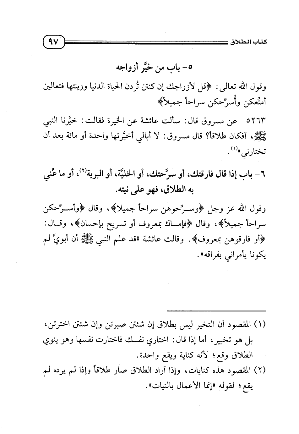 وقول الله - عز وجل -: {وَسَرِّحُوهُنَّ سَرَاحًا جَمِيلًا} [الأحزاب: 49] وقال {وَأُسَرِّحْكُنَّ سَرَاحًا جَمِيلًا} [الأحزاب: 28]، وقال {فَإِمْسَاكٌ بِمَعْرُوفٍ أَوْ تَسْرِيحٌ بِإِحْسَانٍ} [البقرة: 229]، وقال: {أَوْ فَارِقُوهُنَّ بِمَعْرُوفٍ} [الطلاق: 2]. وقالت عائشة «قد علم النبي - صلى الله عليه وسلم - أن أبويَّ لم يكونا يأمراني بفراقه».