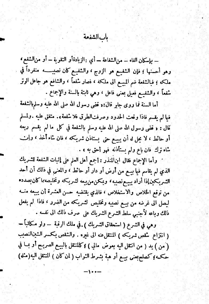 أَمَّا السُّنَّةُ فَمَا رَوَى جَابِرٌ قَالَ: «قَضَى رَسُولُ اللَّهِ - صَلَّى اللَّهُ عَلَيْهِ وَسَلَّمَ - بِالشُّفْعَةِ فِيمَا لَمْ يُقْسَمْ فَإِذَا وَقَعَتْ الْحُدُودُ وَصُرِفَتْ الطُّرُقُ فَلَا شُفْعَةَ» . مُتَّفَقٌ عَلَيْهِ. وَلِمُسْلِمٍ قَالَ: «قَضَى رَسُولُ اللَّهِ - صَلَّى اللَّهُ عَلَيْهِ وَسَلَّمَ - بِالشُّفْعَةِ فِي كُلِّ مَا لَمْ يُقْسَمْ رَبْعَةٍ أَوْ حَائِطٍ، لَا يَحِلُّ لَهُ أَنْ يَبِيعَ حَتَّى يَسْتَأْذِنَ شَرِيكَهُ، فَإِنْ شَاءَ أَخَذَ، وَإِنْ شَاءَ تَرَكَ فَإِنْ بَاعَ وَلَمْ يَسْتَأْذِنْهُ فَهُوَ أَحَقُّ بِهِ» . وَأَمَّا الْإِجْمَاعُ فَقَالَ ابْنُ الْمُنْذِرِ: أَجْمَعَ أَهْلُ الْعِلْمِ عَلَى إثْبَاتِ الشُّفْعَةِ لِلشَّرِيكِ الَّذِي لَمْ يُقَاسِمْ فِيمَا بِيعَ مِنْ أَرْضٍ أَوْ دَارٍ أَوْ حَائِطٍ، وَالْمَعْنَى فِي ذَلِكَ أَنَّ أَحَدَ الشَّرِيكَيْنِ إذَا أَرَادَ بَيْعَ نَصِيبِهِ، وَيُمْكِنُ مِنْ بَيْعِهِ لِشَرِيكِهِ وَتَخْلِيصِهِ مِمَّا كَانَ بِصَدَدِهِ مِنْ تَوَقُّعِ الْخَلَاصِ وَالِاسْتِخْلَاصِ، فَاَلَّذِي يَقْتَضِيهِ حُسْنُ الْعِشْرَةِ أَنْ يَبِيعَهُ مِنْهُ لِيَصِلَ إلَى غَرَضِهِ مِنْ بَيْعِ نَصِيبِهِ وَتَخْلِيصٍ لِشَرِيكِهِ مِنْ الضَّرَرِ، فَإِذَا لَمْ يَفْعَلْ ذَلِكَ وَبَاعَهُ لِأَجْنَبِيٍّ سَلَّطَ الشَّرْعُ الشَّرِيكَ عَلَى صَرْفِ ذَلِكَ إلَى نَفْسِهِ. وَهِيَ فِي الشَّرْعِ (اسْتِحْقَاقُ الشَّرِيكِ) فِي مِلْكِ الرَّقَبَةِ - وَلَوْ مُكَاتَبًا - (انْتِزَاعَ شِقْصِ شَرِيكِهِ) الْمُنْتَقِلِ عَنْهُ إلَى غَيْرِهِ.