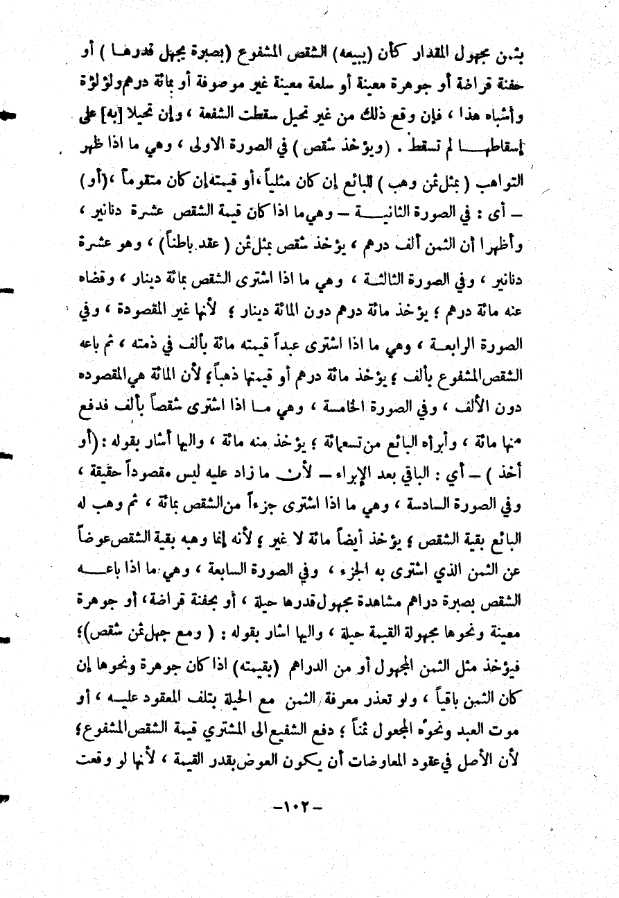 بِثَمَنٍ مَجْهُولِ الْمِقْدَارِ كَأَنْ (يَبِيعَهُ) الشِّقْصَ الْمَشْفُوعَ (بِصُبْرَةٍ يُجْهَلُ قَدْرُهَا) أَوْ حَفْنَةِ قُرَاضَةٍ أَوْ جَوْهَرَةٍ مُعَيَّنَةٍ أَوْ سِلْعَةٍ مُعَيَّنَةٍ غَيْرِ مَوْصُوفَةٍ أَوْ بِمِائَةِ دِرْهَمٍ وَلُؤْلُؤَةٍ وَأَشْبَاهِ هَذَا، فَإِنْ وَقَعَ ذَلِكَ مِنْ غَيْرِ تَحَيُّلٍ سَقَطَتْ الشُّفْعَةُ، وَإِنْ تَحَيُّلًا [بِهِ] عَلَى إسْقَاطِهَا لَمْ تَسْقُطْ.