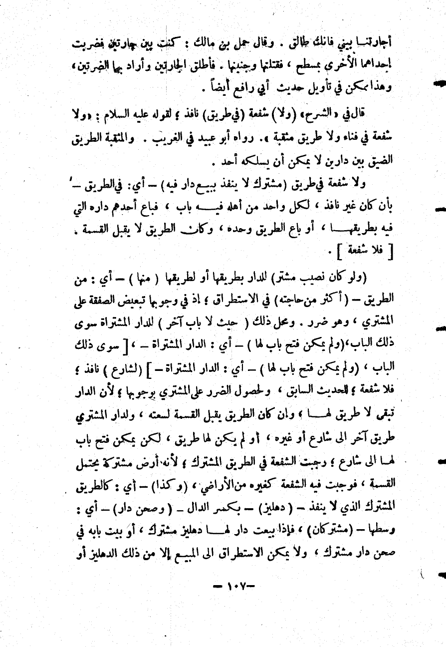 قَالَ فِي " الشَّرْحِ " (وَلَا) شُفْعَةَ (فِي طَرِيقٍ) نَافِذٍ؛ لِقَوْلِهِ - عَلَيْهِ السَّلَامُ -: «وَلَا شُفْعَةَ فِي فِنَاءٍ وَلَا طَرِيقٍ مُثَقَّبَةٍ» . رَوَاهُ أَبُو عُبَيْدٍ فِي الْغَرِيبِ.