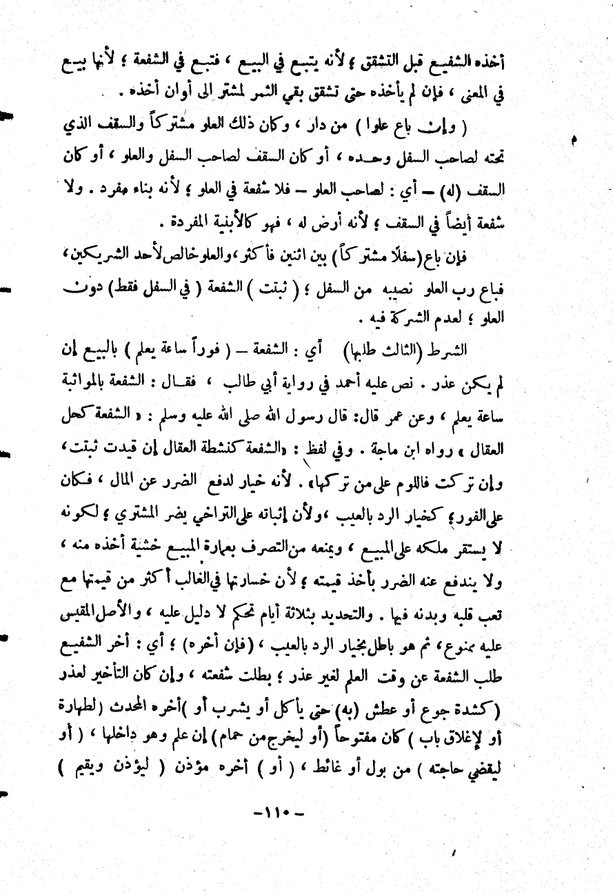 وَالتَّحْدِيدُ بِثَلَاثَةِ أَيَّامٍ تَحَكُّمٌ لَا دَلِيلَ عَلَيْهِ، وَالْأَصْلُ الْمَقِيسُ عَلَيْهِ مَمْنُوعٌ، ثُمَّ هُوَ بَاطِلٌ بِخِيَارِ الرَّدِّ بِالْعَيْبِ، (فَإِنْ أَخَّرَهُ) ؛ أَيْ: أَخَّرَ الشَّفِيعُ طَلَبَ الشُّفْعَةِ عَنْ وَقْتِ الْعِلْمِ لِغَيْرِ عُذْرٍ؛ بَطَلَتْ شُفْعَتُهُ، وَإِنْ كَانَ التَّأْخِيرُ لِعُذْرٍ (كَشِدَّةِ جُوعٍ أَوْ عَطَشٍ بِهِ) حَتَّى يَأْكُلَ أَوْ يَشْرَبَ (أَوْ) أَخَّرَهُ الْمُحْدِثُ (لِطَهَارَةٍ أَوْ لِإِغْلَاقِ بَابٍ) كَانَ مَفْتُوحًا (أَوْ لِيَخْرُجَ مِنْ حَمَّامٍ) إنْ عَلِمَ وَهُوَ دَاخِلُهَا، (أَوْ لِيَقْضِيَ حَاجَتَهُ) مِنْ بَوْلٍ أَوْ غَائِطٍ، (أَوْ) أَخَّرَهُ مُؤَذِّنٌ (لِيُؤَذِّنَ وَيُقِيمَ)