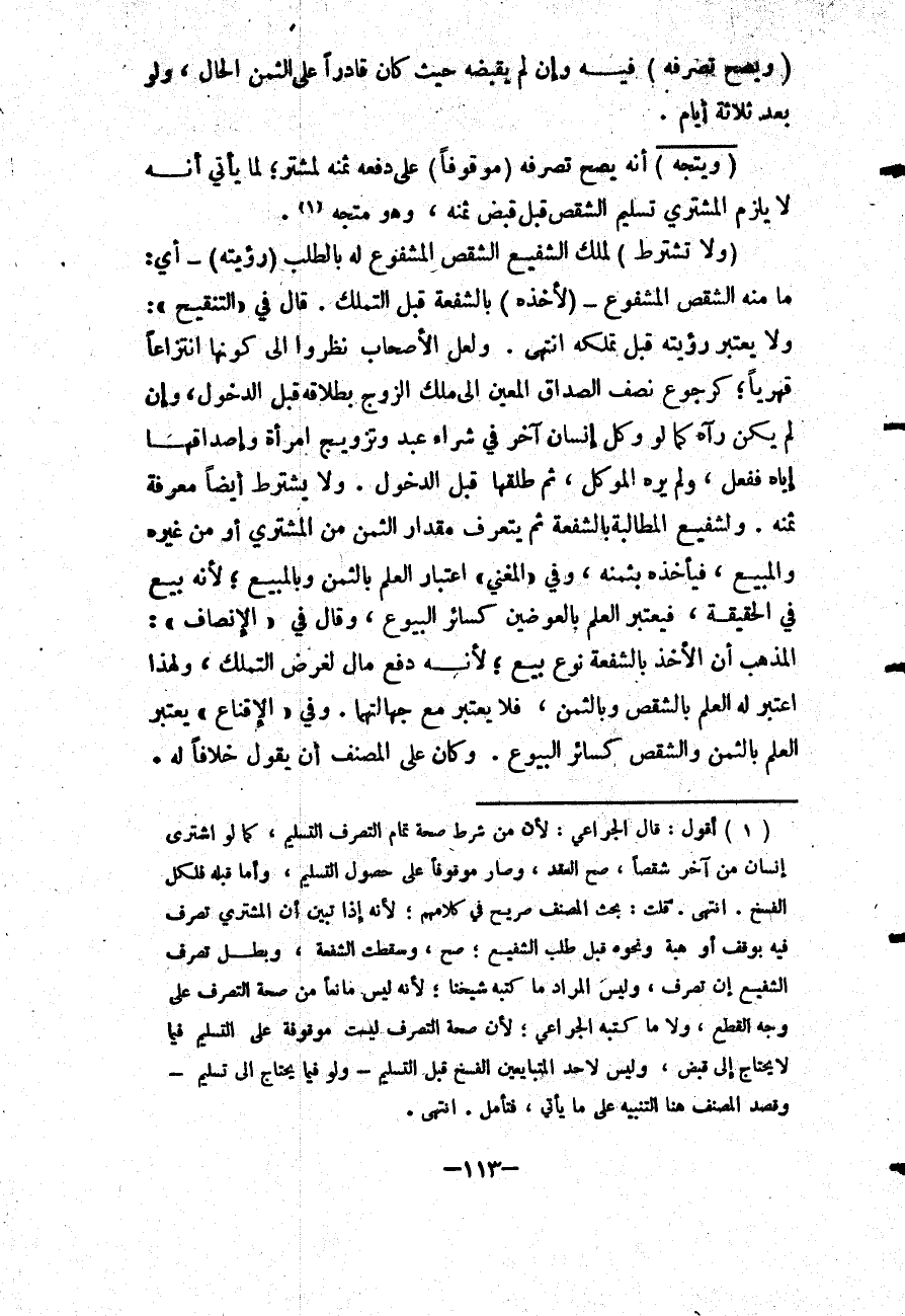 (وَيَتَّجِهُ) أَنَّهُ يَصِحُّ تَصَرُّفُهُ (مَوْقُوفًا) عَلَى دَفْعِهِ ثَمَنَهُ لِمُشْتَرٍ؛ لِمَا يَأْتِي أَنَّهُ لَا يَلْزَمُ الْمُشْتَرِيَ تَسْلِيمُ الشِّقْصِ قَبْلَ قَبْضِ ثَمَنِهِ، وَهُوَ مُتَّجِهٌ.