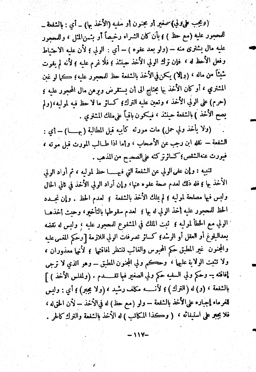 (وَيَجِبُ عَلَى وَلِيِّ) صَغِيرٍ أَوْ مَجْنُونٍ أَوْ سَفِيهٍ (الْأَخْذُ بِهَا) أَيْ: بِالشُّفْعَةِ - لِلْمَحْجُورِ عَلَيْهِ (مَعَ حَظٍّ) ؛ بِأَنْ كَانَ الشِّرَاءُ رَخِيصًا أَوْ بِثَمَنِ الْمِثْلِ، وَلِلْمَحْجُورِ عَلَيْهِ مَالٌ يُشْتَرَى مِنْهُ - (وَلَوْ بَعْدَ عَفْوِهِ) - أَيْ: الْوَلِيِّ؛ لِأَنَّ عَلَيْهِ الِاحْتِيَاطَ. وَفِعْلُ الْأَخْذِ لَهُ، فَإِنْ تَرَكَ الْوَلِيُّ الْأَخْذَ حِينَئِذٍ؛ فَلَا غُرْمَ عَلَيْهِ؛ لِأَنَّهُ لَمْ يُفَوِّتْ شَيْئًا مِنْ مَالِهِ، (وَإِلَّا) يَكُنْ فِي الْأَخْذِ بِالشُّفْعَةِ حَظٌّ لِلْمَحْجُورِ عَلَيْهِ؛ كَمَا لَوْ غَبَنَ الْمُشْتَرِي، أَوْ كَانَ الْأَخْذُ بِهَا يَحْتَاجُ إلَى أَنْ يَسْتَقْرِضَ وَيَرْهَنَ مَالَ الْمَحْجُورِ عَلَيْهِ؛ (حَرُمَ) عَلَى الْوَلِيِّ الْأَخْذُ، وَتَعَيَّنَ عَلَيْهِ التَّرْكُ؛ كَسَائِرِ مَا لَا حَظَّ فِيهِ لِمُوَلِّيهِ، (وَلَمْ يَصِحَّ الْأَخْذُ) بِالشُّفْعَةِ حِينَئِذٍ، فَيَكُونُ بَاقِيًا عَلَى مِلْكِ الْمُشْتَرِي.