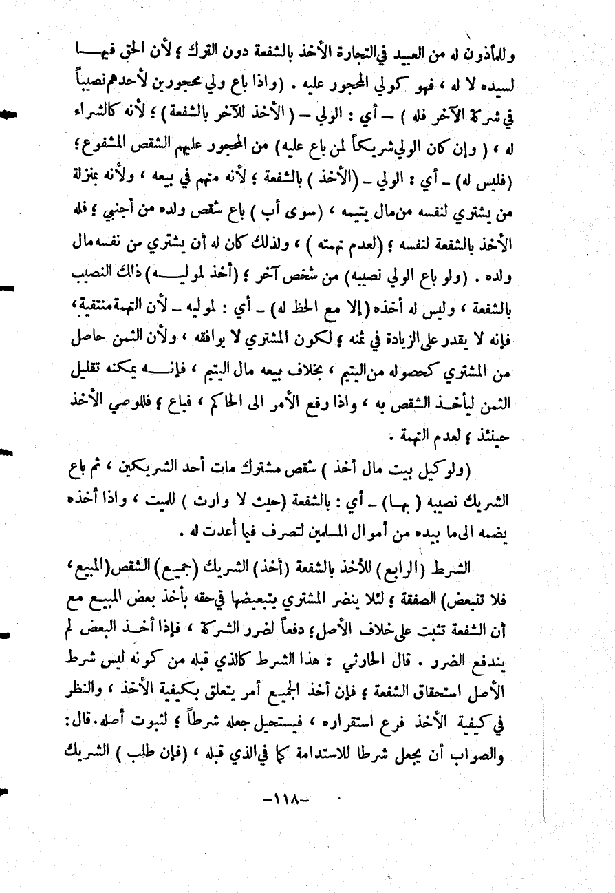 قَالَ الْحَارِثِيُّ: هَذَا الشَّرْطُ كَاَلَّذِي قَبْلَهُ مِنْ كَوْنِهِ لَيْسَ شَرْطُ الْأَصْلِ اسْتِحْقَاقَ الشُّفْعَةِ؛ فَإِنَّ أَخْذَ الْجَمِيعِ أَمْرٌ يَتَعَلَّقُ بِكَيْفِيَّةِ الْأَخْذِ، وَالنَّظَرُ فِي كَيْفِيَّةِ الْأَخْذِ فَرْعُ اسْتِقْرَارِهِ، فَيَسْتَحِيلُ جَعْلُهُ شَرْطًا؛ لِثُبُوتِ أَصْلِهِ. قَالَ: وَالصَّوَابُ أَنْ يُجْعَلَ شَرْطًا لِلِاسْتِدَامَةِ كَمَا فِي الَّذِي قَبْلَهُ، (فَإِنْ طَلَبَ) الشَّرِيكُ
