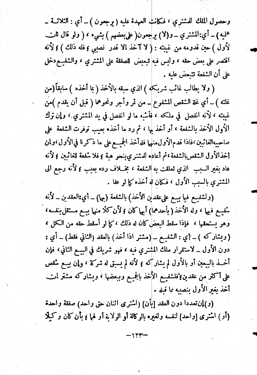 وَحُصُولُ الْمِلْكِ لِلْمُشْتَرِي، فَكَانَتْ الْعُهْدَةُ عَلَيْهِ (يَرْجِعُونَ) - أَيْ: الثَّلَاثَةُ - (عَلَيْهِ) - أَيْ: الْمُشْتَرِي - وَ (لَا) يَرْجِعُونَ (عَلَى بَعْضِهِمْ) بِشَيْءٍ، (وَلَوْ قَالَ ثَانٍ لِأَوَّلٍ) حِينَ قُدُومِهِ مِنْ غَيْبَتِهِ: (لَا آخُذُ إلَّا قَدْرَ نَصِيبِي؛ فَلَهُ ذَلِكَ) ؛ لِأَنَّهُ اقْتَصَرَ عَلَى بَعْضِ حَقِّهِ، وَلَيْسَ فِيهِ تَبْعِيضٌ لِلصَّفْقَةِ عَلَى الْمُشْتَرِي، وَالشَّفِيعُ دَخَلَ عَلَى أَنَّ الشُّفْعَةَ تَتَبَعَّضُ عَلَيْهِ