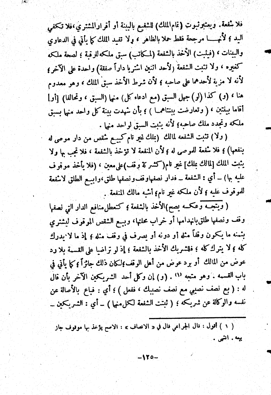 (وَلَا) تَثْبُتُ الشُّفْعَةُ لِمَالِكٍ (بِمِلْكٍ غَيْرِ تَامٍّ كَبَيْعِ شِقْصٍ مِنْ دَارٍ مُوصًى لَهُ بِنَفْعِهَا) ؛ فَلَا شُفْعَةَ لِلْمُوصَى لَهُ؛ لِأَنَّ الْمَنْفَعَةَ لَا تُؤْخَذُ بِالشُّفْعَةِ فَلَا تَجِبُ بِهَا وَلَا يَثْبُتُ الْمِلْكُ [لِمَالِكٍ بِمِلْكٍ] غَيْرِ تَامٍّ (كَشَرِكَةِ وَقْفٍ) عَلَى مُعَيَّنٍ، (فَلَا يَأْخُذُ مَوْقُوفٌ عَلَيْهِ بِهَا) - أَيْ: الشُّفْعَةِ - فَدَارٌ نِصْفُهَا وَقْفٌ وَنِصْفُهَا طَلْقٌ، وَبِيعَ الطَّلْقُ لَا شُفْعَةَ لِلْمَوْقُوفِ عَلَيْهِ؛ لِأَنَّ مِلْكَهُ غَيْرُ تَامٍّ؛ أَشْبَهَ مَالِكَ الْمَنْفَعَةِ.