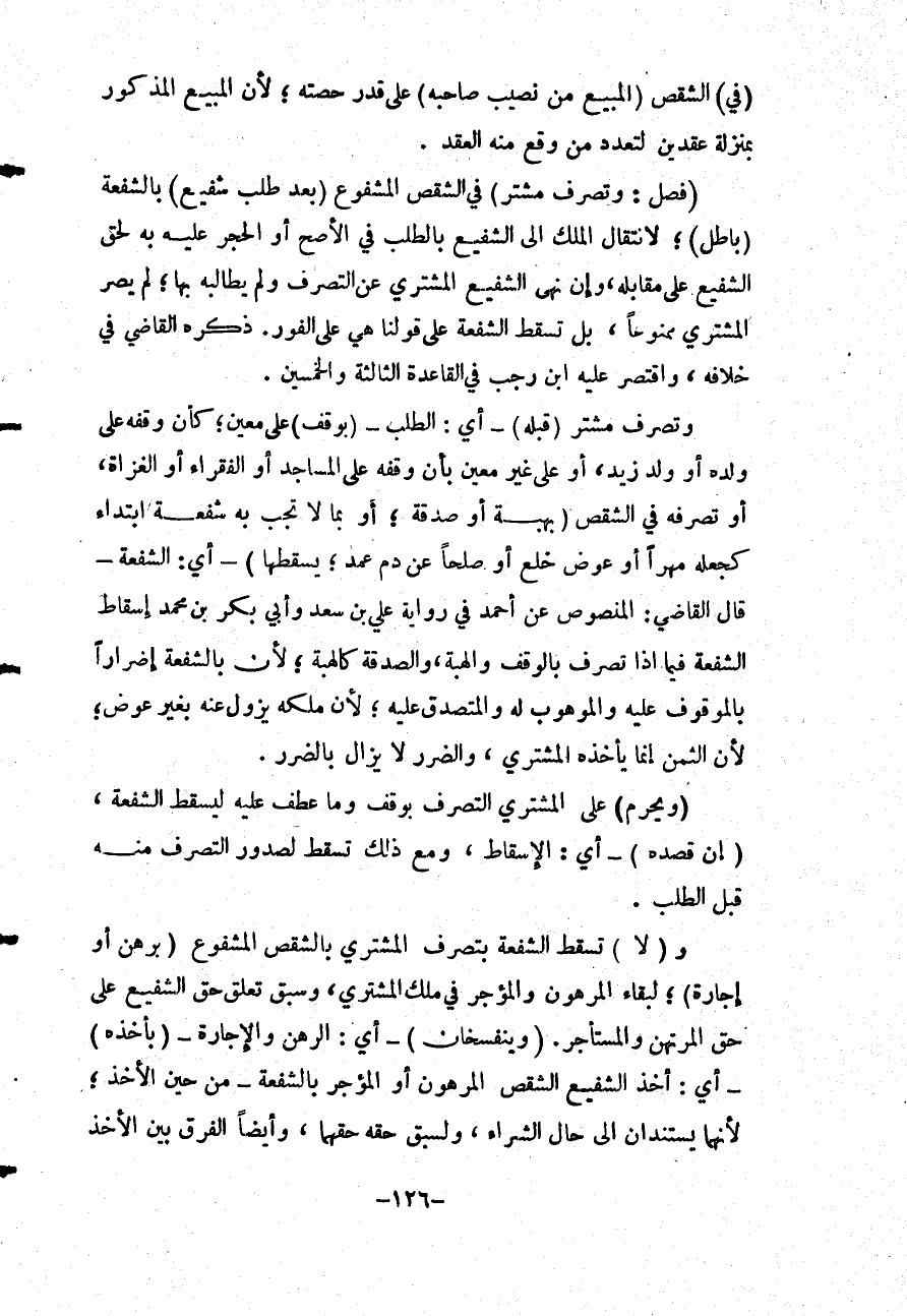 ذَكَرَهُ الْقَاضِي فِي خِلَافِهِ، وَاقْتَصَرَ عَلَيْهِ ابْنُ رَجَبٍ فِي الْقَاعِدَةِ الثَّالِثَةِ وَالْخَمْسِينَ. وَتَصَرُّفُ مُشْتَرٍ (قَبْلَهُ) - أَيْ: الطَّلَبِ - (بِوَقْفٍ) عَلَى مُعَيَّنٍ؛ كَأَنْ وَقَفَهُ عَلَى وَلَدِهِ أَوْ وَلَدِ زَيْدٍ، أَوْ عَلَى غَيْرِ مُعَيَّنٍ بِأَنْ وَقَفَهُ عَلَى الْمَسَاجِدِ أَوْ الْفُقَرَاءِ أَوْ الْغُزَاةِ، أَوْ تَصَرُّفُهُ فِي الشِّقْصِ (بِهِبَةٍ أَوْ صَدَقَةٍ؛ أَوْ بِمَا لَا تَجِبُ بِهِ شُفْعَةٌ ابْتِدَاءً كَجَعْلِهِ مَهْرًا أَوْ عِوَضَ خُلْعٍ أَوْ صُلْحًا عَنْ دَمِ عَمْدٍ؛ يُسْقِطُهَا) - أَيْ: الشُّفْعَةَ - قَالَ الْقَاضِي: الْمَنْصُوصُ عَنْ أَحْمَدَ فِي رِوَايَةِ عَلِيِّ بْنِ سَعِيدٍ وَأَبِي بَكْرِ بْنِ مُحَمَّدٍ إسْقَاطُ الشُّفْعَةِ فِيمَا إذَا تَصَرَّفَ بِالْوَقْفِ وَالْهِبَةِ، وَالصَّدَقَةُ كَالْهِبَةِ؛ لِأَنَّ بِالشُّفْعَةِ إضْرَارًا بِالْمَوْقُوفِ عَلَيْهِ وَالْمَوْهُوبِ لَهُ وَالْمُتَصَدَّقِ عَلَيْهِ؛ لِأَنَّ مِلْكَهُ يَزُولُ عَنْهُ بِغَيْرِ عِوَضٍ؛ لِأَنَّ الثَّمَنَ إنَّمَا يَأْخُذُهُ الْمُشْتَرِي، وَالضَّرَرُ لَا يُزَالُ بِالضَّرَرِ.
