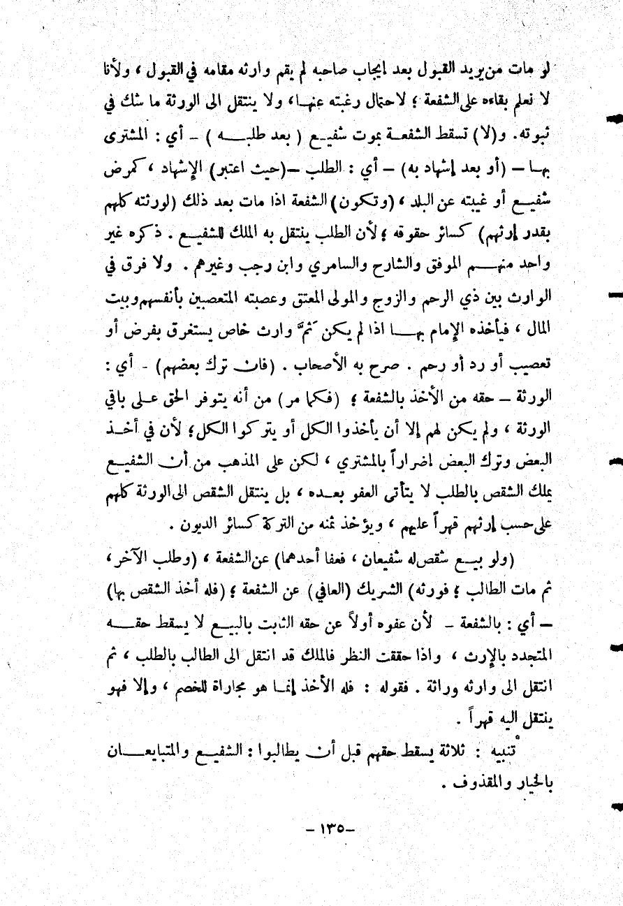 وَ (لَا) تَسْقُطُ الشُّفْعَةُ بِمَوْتِ شَفِيعٍ (بَعْدَ طَلَبِهِ) أَيْ: الْمُشْتَرِي بِهَا - (أَوْ بَعْدَ إشْهَادٍ بِهِ) - أَيْ: الطَّلَبِ - (حَيْثُ اُعْتُبِرَ) الْإِشْهَادُ، كَمَرَضِ شَفِيعٍ أَوْ غَيْبَتِهِ عَنْ الْبَلَدِ، (وَتَكُونُ) الشُّفْعَةُ إذَا مَاتَ بَعْدَ ذَلِكَ (لِوَرَثَتِهِ كُلِّهِمْ بِقَدْرِ إرْثِهِمْ) كَسَائِرِ حُقُوقِهِ؛ لِأَنَّ الطَّلَبَ يَنْتَقِلُ بِهِ الْمِلْكُ لِلشَّفِيعِ. ذَكَرَهُ غَيْرُ وَاحِدٍ مِنْهُمْ الْمُوَفَّقُ وَالشَّارِحُ وَالسَّامِرِيُّ وَابْنُ رَجَبٍ وَغَيْرُهُمْ. وَلَا فَرْقَ فِي الْوَارِثِ بَيْنَ ذِي الرَّحِمِ وَالزَّوْجِ وَالْمَوْلَى الْمُعْتَقِ وَعَصَبَتِهِ الْمُتَعَصِّبِينَ بِأَنْفُسِهِمْ وَبَيْتِ الْمَالِ، فَيَأْخُذُهُ الْإِمَامُ بِهَا إذَا لَمْ يَكُنْ ثَمَّ وَارِثٌ خَاصٌّ يَسْتَغْرِقُ بِفَرْضٍ أَوْ تَعْصِيبٍ أَوْ رَدٍّ أَوْ رَحِمٍ. صَرَّحَ بِهِ الْأَصْحَابُ.