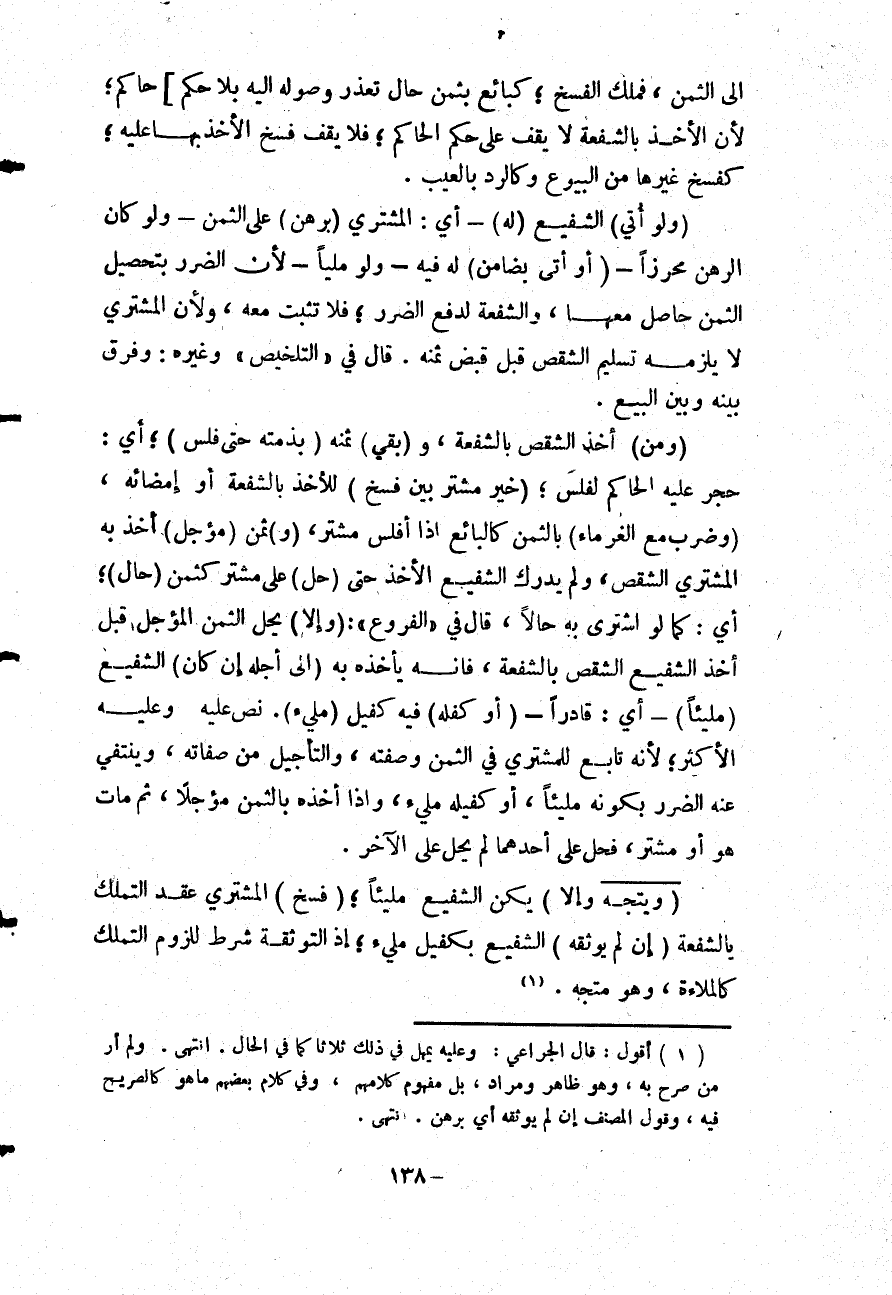 (وَمَنْ) أَخَذَ الشِّقْصَ بِالشُّفْعَةِ، وَ (بَقِيَ) ثَمَنُهُ (بِذِمَّتِهِ حَتَّى فُلِّسَ) ؛ أَيْ: حَجَرَ عَلَيْهِ الْحَاكِمُ لِفَلَسٍ؛ (خُيِّرَ مُشْتَرٍ بَيْنَ فَسْخٍ) لِلْأَخْذِ بِالشُّفْعَةِ أَوْ إمْضَائِهِ، (وَضَرَبَ مَعَ الْغُرَمَاءِ) بِالثَّمَنِ كَالْبَائِعِ إذَا أَفْلَسَ مُشْتَرٍ، (وَ) ثَمَنٍ (مُؤَجَّلٍ) أَخَذَ بِهِ الْمُشْتَرِي الشِّقْصَ، وَلَمْ يُدْرِكْ الشَّفِيعُ الْأَخْذَ حَتَّى (حَلَّ) عَلَى مُشْتَرٍ كَثَمَنٍ (حَالٍّ) ؛ أَيْ: كَمَا لَوْ اشْتَرَى بِهِ حَالًّا، قَالَ فِي " الْفُرُوعِ ": (وَإِلَّا) يَحِلُّ الثَّمَنُ الْمُؤَجَّلُ قَبْلَ أَخْذِ الشَّفِيعِ الشِّقْصَ بِالشُّفْعَةِ، فَإِنَّهُ يَأْخُذُهُ بِهِ (إلَى أَجَلِهِ إنْ كَانَ) الشَّفِيعُ (مَلِيئًا) - أَيْ: قَادِرًا - (أَوْ كَفَّلَهُ) فِيهِ كَفِيلٌ (مَلِيءٌ) نَصَّ عَلَيْهِ وَعَلَيْهِ الْأَكْثَرُ؛ لِأَنَّهُ تَابِعٌ لِلْمُشْتَرِي فِي الثَّمَنِ وَصِفَتِهِ، وَالتَّأْجِيلُ مِنْ صِفَاتِهِ، وَيَنْتَفِي عَنْهُ الضَّرَرُ بِكَوْنِهِ مَلِيئًا، أَوْ كَفِيلُهُ مَلِيءٌ، وَإِذَا أَخَذَهُ بِالثَّمَنِ مُؤَجَّلًا، ثُمَّ مَاتَ هُوَ أَوْ مُشْتَرٍ، فَحَلَّ عَلَى أَحَدِهِمَا لَمْ يَحِلَّ عَلَى الْآخَرِ.