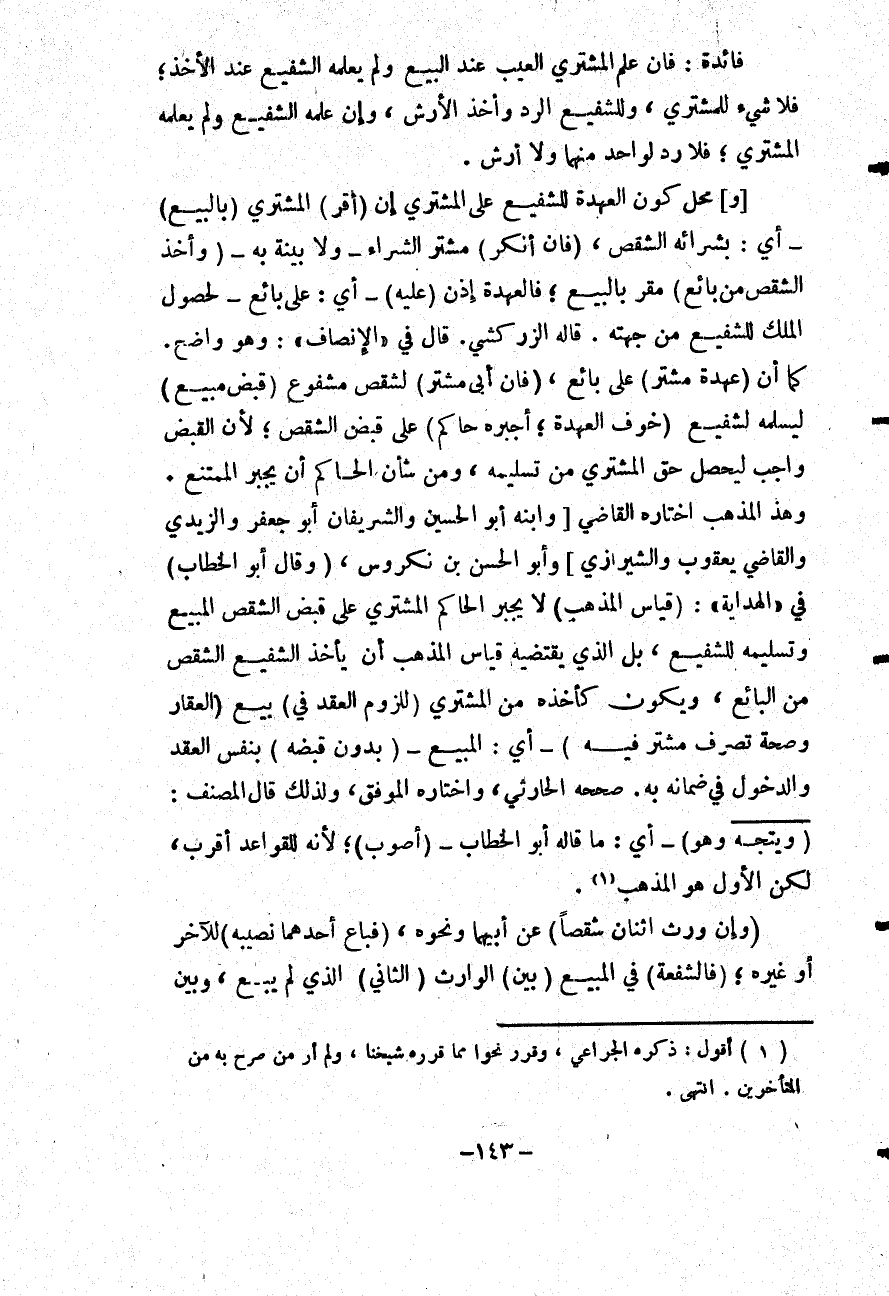 قَالَ فِي " الْإِنْصَافِ ": وَهُوَ وَاضِحٌ. كَمَا أَنَّ (عُهْدَةَ مُشْتَرٍ) عَلَى بَائِعٍ، (فَإِنْ أَبَى مُشْتَرٍ) لِشِقْصٍ مَشْفُوعٍ (قَبْضَ مَبِيعٍ) لِيُسَلِّمَهُ لِشَفِيعٍ (خَوْفَ الْعُهْدَةِ؛ أَجْبَرَهُ حَاكِمٌ) عَلَى قَبْضِ الشِّقْصِ؛ لِأَنَّ الْقَبْضَ وَاجِبٌ لِيَحْصُلَ حَقُّ الْمُشْتَرِي مِنْ تَسْلِيمِهِ، وَمِنْ شَأْنِ الْحَاكِمِ أَنْ يُجْبِرَ الْمُمْتَنِعَ. وَهَذَا الْمَذْهَبُ اخْتَارَهُ الْقَاضِي [وَابْنُهُ أَبُو الْحُسَيْنِ وَالشَّرِيفَانِ أَبُو جَعْفَرٍ وَالزَّيْدِيُّ وَالْقَاضِي يَعْقُوبُ وَالشِّيرَازِيُّ] وَأَبُو الْحَسَنِ بْنُ بَكْرُوسٍ، (وَقَالَ أَبُو الْخَطَّابِ) فِي " الْهِدَايَةِ ": (قِيَاسُ الْمَذْهَبِ) لَا يُجْبِرُ الْحَاكِمُ الْمُشْتَرِيَ عَلَى قَبْضِ الشِّقْصِ الْمَبِيعِ وَتَسْلِيمِهِ لِلشَّفِيعِ، بَلْ الَّذِي يَقْتَضِيهِ قِيَاسُ الْمَذْهَبِ أَنْ يَأْخُذَ الشَّفِيعُ الشِّقْصَ مِنْ الْبَائِعِ، وَيَكُونَ كَأَخْذِهِ مِنْ الْمُشْتَرِي (لِلُّزُومِ الْعَقْدِ فِي) بَيْعِ (الْعَقَارِ وَصِحَّةِ تَصَرُّفِ مُشْتَرٍ فِيهِ) - أَيْ: الْمَبِيعِ - (بِدُونِ قَبْضِهِ) بِنَفْسِ الْعَقْدِ وَالدُّخُولِ فِي ضَمَانِهِ بِهِ. صَحَّحَهُ الْحَارِثِيُّ وَاخْتَارَهُ الْمُوَفَّقُ، وَلِذَلِكَ قَالَ الْمُصَنِّفُ: (وَيَتَّجِهُ وَهُوَ) - أَيْ: مَا قَالَهُ أَبُو الْخَطَّابِ - (أَصْوَبُ) ؛ لِأَنَّهُ لِلْقَوَاعِدِ أَقْرَبُ، لَكِنَّ الْأَوَّلَ هُوَ الْمَذْهَبُ.