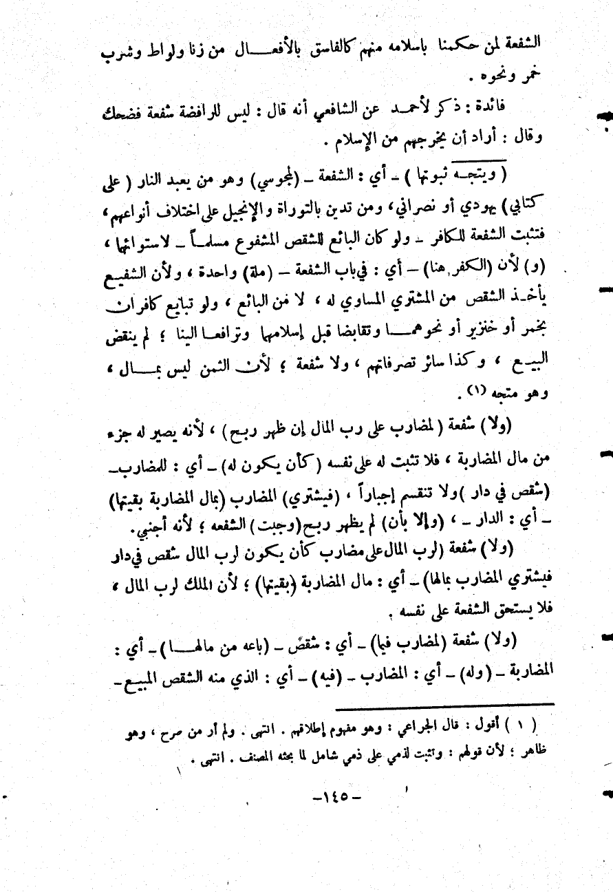 (وَيَتَّجِهُ ثُبُوتُهَا) - أَيْ: الشُّفْعَةِ - (لِمَجُوسِيٍّ) وَهُوَ مَنْ يَعْبُدُ النَّارَ (عَلَى كِتَابِيٍّ) يَهُودِيٍّ أَوْ نَصْرَانِيٍّ، وَمَنْ تَدَيَّنَ بِالتَّوْرَاةِ وَالْإِنْجِيلِ عَلَى اخْتِلَافِ أَنْوَاعِهِمْ، فَتَثْبُتُ الشُّفْعَةُ لِلْكَافِرِ - وَلَوْ كَانَ الْبَائِعُ لِلشِّقْصِ الْمَشْفُوعِ مُسْلِمًا - لِاسْتِوَائِهِمَا، (وَ) لِأَنَّ (الْكُفْرَ هُنَا) - أَيْ فِي بَابِ الشُّفْعَةِ - (مِلَّةٌ) وَاحِدَةٌ، وَلِأَنَّ الشَّفِيعَ يَأْخُذُ الشِّقْصَ مِنْ الْمُشْتَرِي الْمُسَاوِي لَهُ، لَا مِنْ الْبَائِعِ.