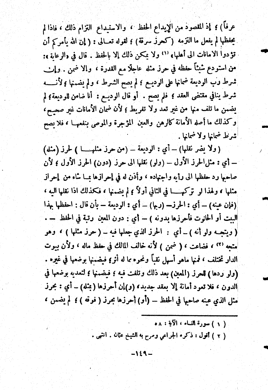 عُرْفًا) ؛ إذْ الْمَقْصُودُ مِنْ الْإِيدَاعِ الْحِفْظُ، وَالِاسْتِيدَاعُ الْتِزَامُ ذَلِكَ، فَإِذَا لَمْ يَحْفَظْهَا لَمْ يَفْعَلْ مَا الْتَزَمَهُ (كَحِرْزِ سَرِقَةٍ) ؛ لِقَوْلِهِ تَعَالَى: {إِنَّ اللَّهَ يَأْمُرُكُمْ أَنْ تُؤَدُّوا الأَمَانَاتِ إِلَى أَهْلِهَا} [النساء: 58] وَلَا يُمْكِنُ ذَلِكَ إلَّا بِالْحِفْظِ. قَالَ فِي الرِّعَايَةِ ": مَنْ اُسْتُوْدِعَ شَيْئًا حَفِظَهُ فِي حِرْزِ مِثْلِهِ عَاجِلًا مَعَ الْقُدْرَةِ، وَإِلَّا ضَمِنَ.
