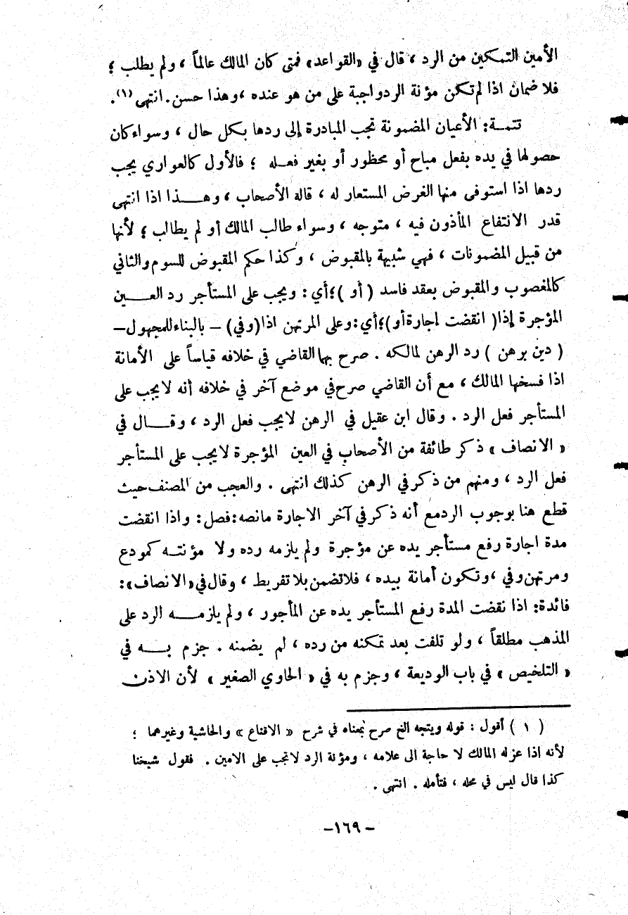 وَالْعَجَبُ مِنْ الْمُصَنِّفِ حَيْثُ قَطَعَ هُنَا بِوُجُوبِ الرَّدِّ مَعَ أَنَّهُ ذَكَرَ فِي آخَرِ الْإِجَارَةِ مَا نَصُّهُ: فَصْلٌ: وَإِذَا انْقَضَتْ مُدَّةُ إجَارَةٍ رَفَعَ مُسْتَأْجَرٌ يَدَهُ عَنْ مُؤَجَّرِهِ وَلَمْ يَلْزَمْهُ رَدُّهُ وَلَا مُؤْنَتُهُ كَمُودِعٍ وَمُرْتَهِنٍ وُفِيَ، وَتَكُونُ أَمَانَةً بِيَدِهِ، فَلَا تُضَمَّنُ بِلَا تَفْرِيطٍ، وَقَالَ فِي الْإِنْصَافِ ".