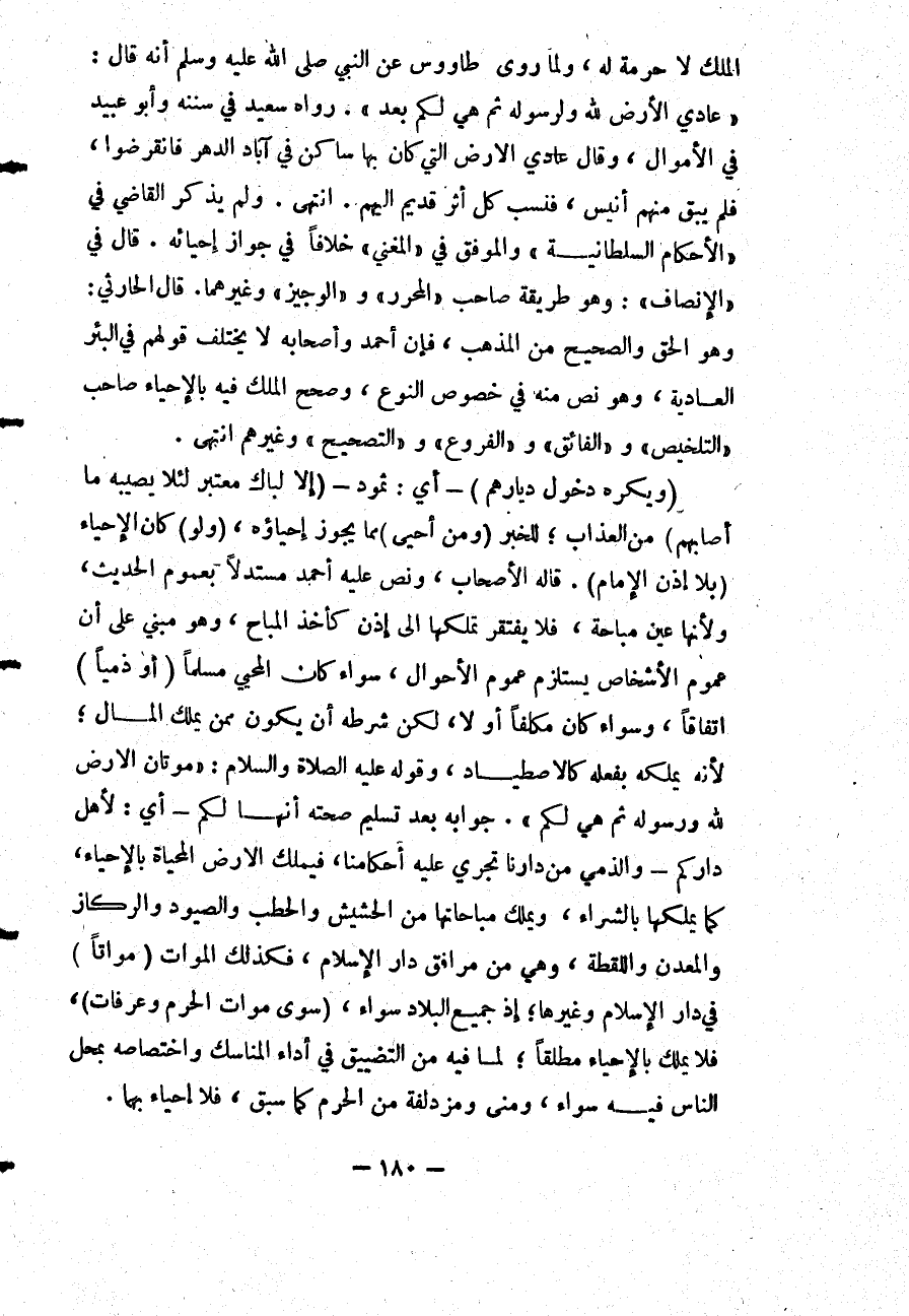 وَلَمْ يَذْكُرْ الْقَاضِي فِي " الْأَحْكَامِ السُّلْطَانِيَّةِ " وَالْمُوَفَّقُ فِي " الْمُغْنِي " خِلَافًا فِي جَوَازِ إحْيَائِهِ. قَالَ فِي " الْإِنْصَافِ ": وَهُوَ طَرِيقَةُ صَاحِبِ " الْمُحَرَّرِ وَ " الْوَجِيزِ وَغَيْرِهِمَا.