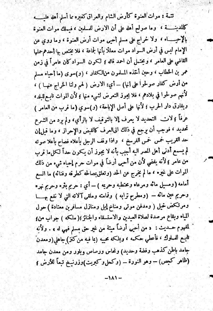 تَتِمَّةٌ: مَوَاتُ الْعَنْوَةِ كَأَرْضِ الشَّام وَالْعِرَاقِ كَغَيْرِهِ مِمَّا أَسْلَمَ أَهْلُهُ عَلَيْهِ كَالْمَدِينَةِ، وَمَا صُولِحَ أَهْلُهُ عَلَى أَنَّ الْأَرْضَ لِلْمُسْلِمِينَ، فَيُمْلَكُ مَوَاتُ الْعَنْوَةِ بِالْإِحْيَاءِ، وَلَا خَرَاجَ عَلَى مُسْلِمٍ أَحْيَا مَوَاتَ أَرْضِ الْعَنْوَةِ، وَمَا رُوِيَ عَنْ الْإِمَامِ لَيْسَ فِي أَرْضِ السَّوَادِ مَوَاتٌ مُعَلِّلًا بِأَنَّهَا لِجَمَاعَةٍ، فَلَا يَخْتَصُّ بِهَا أَحَدُهُمْ حَمَلَهَا الْقَاضِي عَلَى الْعَامِرِ، وَيُحْتَمَلُ أَنَّ أَحْمَدَ قَالَهُ؛ لِكَوْنِ السَّوَادِ كَانَ عَامِرًا فِي زَمَنِ عُمَرَ بْنِ الْخَطَّابِ، وَحِينَ أَخَذَهُ الْمُسْلِمُونَ مِنْ الْكُفَّارِ، (وَ) سِوَى (مَا أَحْيَاهُ مُسْلِمٌ مِنْ أَرْضِ كُفَّارٍ صُولِحُوا عَلَى أَنَّهَا) - أَيْ: الْأَرْضَ (لَهُمْ وَلَنَا الْخَرَاجُ عَنْهَا) ، لِأَنَّهُمْ صُولِحُوا فِي بِلَادِهِمْ، فَلَا يَجُوزُ التَّعَرُّضُ لِشَيْءٍ مِنْهَا؛ لِأَنَّ الْمَوَاتَ تَابِعٌ لِلْبَلَدِ، وَيُفَارِقُ دَارَ الْحَرْبِ؛ لِأَنَّهَا عَلَى أَصْلِ الْإِبَاحَةِ، (وَ) سِوَى (مَا قَرُبَ مِنْ الْعَامِرِ) عُرْفًا؛ لِأَنَّ التَّحْدِيدَ لَا يُعْرَفُ إلَّا بِالتَّوْقِيفِ لَا بِالرَّأْيِ، وَلَمْ يَرِدْ مِنْ الشَّرْعِ تَحْدِيدٌ، فَوَجَبَ أَنْ يَرْجِعَ فِي ذَلِكَ إلَى الْعُرْفِ كَالْقَبْضِ وَالْإِحْرَازِ، وَمَا قِيلَ: إنَّ حَدَّ الْقَرِيبِ خُمُسُ خُمُسِ الْفَرْسَخِ، وَإِذَا وَقَفَ الرَّجُلُ بِأَعْلَاهُ فَصَاحَ بِأَعْلَى صَوْتِهِ لَمْ يَسْمَعْ أَدْنَى أَهْلِ الْمِصْرِ إلَيْهِ أُجِيبَ بِأَنَّهُ لَا يَجُوزُ أَنْ يَكُونَ حَدًّا لِكُلِّ مَا قَرُبَ مِنْ عَامِرٍ؛ لِأَنَّهُ يُفْضِي لِأَنَّ مَنْ أَحْيَا أَرْضًا فِي مَوَاتٍ حُرِّمَ إحْيَاءُ شَيْءٍ مِنْ ذَلِكَ الْمَوَاتِ عَلَى غَيْرِهِ، مَا لَمْ يَخْرُجْ عَنْ الْحَدِّ (وَتَعَلَّقَ بِمَصَالِحِهِ كَطُرُقِهِ وَفِنَائِهِ) مَا اتَّسَعَ أَمَامَهُ (وَمَسِيلِ مَائِهِ وَمَرْعَاهُ وَمُحْتَطَبِهِ وَحَرِيمِهِ) - أَيْ: حَرِيمِ بِئْرِهِ وَحَرِيمِ نَهْرِهِ وَحَرِيمِ عَيْنِ مَائِهِ - (وَمَطْرَحِ تُرَابِهِ) وَقُمَامَتِهِ وَمُلْقَى آلَاتِهِ الَّتِي لَا نَفْعَ بِهَا وَمُرْتَكَضِ خَيْلٍ (وَمَدْفِنِ مَوْتَى وَمُنَاخِ إبِلٍ وَمَنَازِلِ مُسَافِرِينَ مُعْتَادَةٍ) حَوْلَ الْمِيَاهِ وَبِقَاعٍ مُرْصَدَةٍ لِصَلَاةِ الْعِيدَيْنِ وَالِاسْتِسْقَاءِ وَالْجَنَائِزِ؛ (مَلَكَهُ) جَوَابُ مَنْ؛ لِمَفْهُومِ حَدِيثِ: «مَنْ أَحْيَا أَرْضًا مَيِّتَةً مِنْ غَيْرِ حَقِّ مُسْلِمٍ فَهِيَ لَهُ» .
