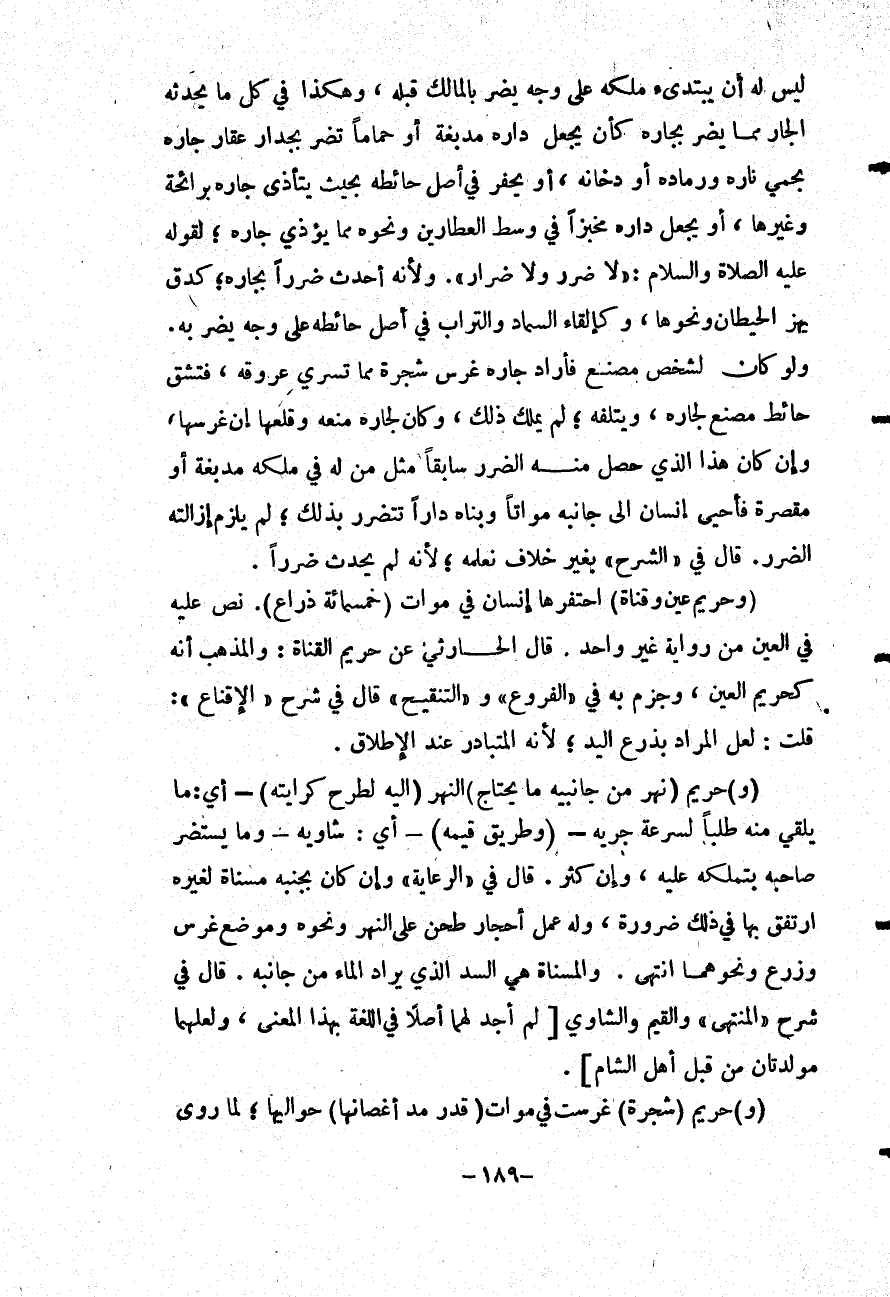 لَيْسَ لَهُ أَنْ يَبْتَدِئَ مِلْكَهُ عَلَى وَجْهٍ يَضُرُّ بِالْمَالِكِ قَبْلَهُ، وَهَكَذَا فِي كُلِّ مَا يُحْدِثُهُ الْجَارُ مِمَّا يَضُرُّ بِجَارِهِ كَأَنْ يَجْعَلَ دَارِهِ مَدْبَغَةً أَوْ حَمَّامًا تَضُرُّ بِجِدَارِ عَقَارِ جَارِهِ بِحَمِي نَارِهِ وَرَمَادِهِ أَوْ دُخَانِهِ، أَوْ يَحْفِرُ فِي أَصْلِ حَائِطِهِ بِحَيْثُ يَتَأَذَّى جَارُهُ بِرَائِحَةٍ وَغَيْرِهَا، أَوْ يَجْعَلُ دَارِهِ مَخْبِزًا فِي وَسَطِ الْعَطَّارِينَ وَنَحْوِهِ مِمَّا يُؤْذِي جَارَهُ؛ لِقَوْلِهِ - عَلَيْهِ الصَّلَاةُ وَالسَّلَامُ -: «لَا ضَرَرَ وَلَا ضِرَارَ» . وَلِأَنَّهُ أَحْدَثَ ضَرَرًا بِجَارِهِ؛ كَدَقٍّ يَهُزُّ الْحِيطَانَ وَنَحْوَهَا، وَكَإِلْقَاءِ السَّمَادِ وَالتُّرَابِ فِي أَصْلِ حَائِطِهِ عَلَى وَجْهٍ يَضُرُّ بِهِ.