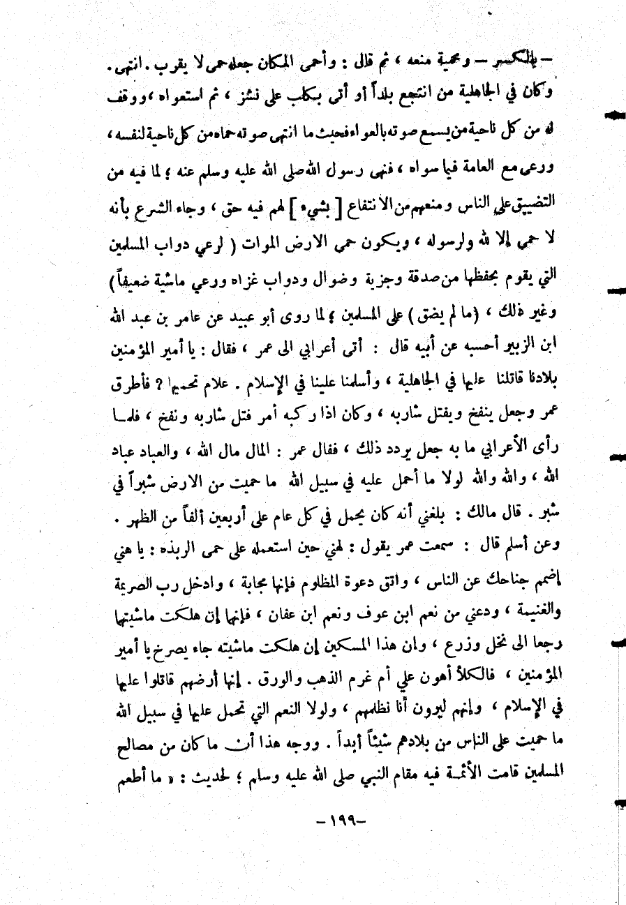 وَعَنْ أَسْلَمَ قَالَ: سَمِعْت عُمَرَ يَقُولُ: لِهُنِيٍّ حِينَ اسْتَعْمَلَهُ عَلَى حِمَى الرَّبْذَةِ: يَا هَنِيُّ اُضْمُمْ جَنَاحَك عَنْ النَّاسِ، وَاتَّقِ دَعْوَةَ الْمَظْلُومِ فَإِنَّهَا مُجَابَةٌ، وَأَدْخِلْ رَبَّ الصُّرَيْمَةِ وَالْغَنِيمَةِ، وَدَعْنِي مِنْ نَعَمِ ابْنِ عَوْفٍ وَنَعَمِ ابْنِ عَفَّانَ، فَإِنَّهُمَا إنْ هَلَكَتْ مَاشِيَتُهُمَا رَجَعَا إلَى نَخْلٍ وَزَرْعٍ، وَإِنَّ هَذَا الْمِسْكِينَ إنْ هَلَكَتْ مَاشِيَتُهُ جَاءَ يَصْرُخُ يَا أَمِيرَ الْمُؤْمِنِينَ، فَالْكَلَأُ أَهْوَنُ عَلَيَّ أَمْ غُرْمُ الذَّهَبِ وَالْوَرِقِ. إنَّهَا أَرْضُهُمْ قَاتَلُوا عَلَيْهَا فِي الْإِسْلَامِ، وَإِنَّهُمْ لَيَرَوْنَ أَنَّا نَظْلِمُهُمْ، وَلَوْلَا النَّعَمُ الَّتِي تَحْمِلُ عَلَيْهَا فِي سَبِيلِ اللَّهِ مَا حَمَيْت عَلَى النَّاسِ مِنْ بِلَادِهِمْ شَيْئًا أَبَدًا. وَوَجْهُ هَذَا أَنَّ مَا كَانَ مِنْ مَصَالِحِ الْمُسْلِمِينَ قَامَتْ الْأَئِمَّةُ فِيهِ مَقَامَ النَّبِيِّ - صَلَّى اللَّهُ عَلَيْهِ وَسَلَّمَ -؛ لِحَدِيثِ «مَا أَطْعَمَ