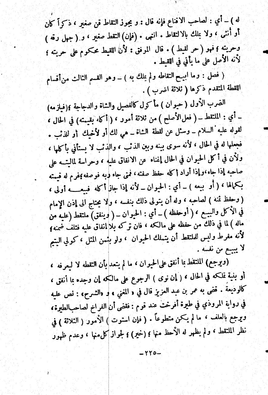 الضَّرْب الْأَوَّلُ: (حَيَوَانٌ) مَأْكُولٌ كَالْفَصِيلِ وَالشَّاةِ وَالدَّجَاجَةِ؛ (فَيَلْزَمُهُ) - أَيْ: الْمُلْتَقِطَ - (فِعْلُ الْأَصْلَحِ) مِنْ ثَلَاثَةِ أُمُورٍ، (أَكْلُهُ بِقِيمَتِهِ) فِي الْحَالِ؛ «لِقَوْلِهِ - عَلَيْهِ السَّلَامُ - وَسُئِلَ عَنْ لُقَطَةِ الشَّاةِ - هِيَ لَك أَوْ لِأَخِيكَ أَوْ لِلذِّئْبِ» ، فَجَعَلَهَا لَهُ فِي الْحَالِ، لِأَنَّهُ سَوَّى بَيْنَهُ وَبَيْنَ الذِّئْبِ، وَالذِّئْبُ لَا يَسْتَأْنِي بِأَكْلِهَا؛ وَلِأَنَّ فِي أَكْلِ الْحَيَوَانِ فِي الْحَالِ إغْنَاءً عَنْ الْإِنْفَاقِ عَلَيْهِ؛ وَحِرَاسَةً لِمَالِيَّتِهِ عَلَى صَاحِبِهِ إذَا جَاءَ، وَإِذَا أَرَادَ أَكْلَهُ حَفِظَ صِفَتَهُ، فَمَتَى جَاءَ رَبُّهُ فَوَصَفَهُ؛ غَرِمَ لَهُ قِيمَتَهُ بِكَمَالِهَا، (أَوْ بَيْعُهُ) - أَيْ: الْحَيَوَانَ - لِأَنَّهُ إذَا جَازَ أَكْلُهُ فَبَيْعُهُ أَوْلَى، (وَحِفْظُ ثَمَنِهِ) لِصَاحِبِهِ، وَلَهُ أَنْ يَتَوَلَّى ذَلِكَ بِنَفْسِهِ، وَلَا يَحْتَاجُ إلَى إذْنِ الْإِمَامِ فِي الْأَكْلِ وَالْبَيْعِ، (أَوْ حِفْظُهُ) - أَيْ: الْحَيَوَانَ - (وَيُنْفِقُ) مُلْتَقِطٌ (عَلَيْهِ مِنْ مَالِهِ) لِمَا فِي ذَلِكَ مِنْ حِفْظِهِ عَلَى مَالِكِهِ، فَإِنْ تَرَكَهُ بِلَا إنْفَاقٍ عَلَيْهِ فَتَلِفَ ضَمِنَهُ؛ لِأَنَّهُ مُفَرِّطٌ، وَلَيْسَ لِلْمُلْتَقِطِ أَنْ يَتَمَلَّكَ الْحَيَوَانَ، وَلَوْ بِثَمَنِ الْمِثْلِ كَوَلِيِّ الْيَتِيمِ لَا يَبِيعُ مِنْ نَفْسِهِ.