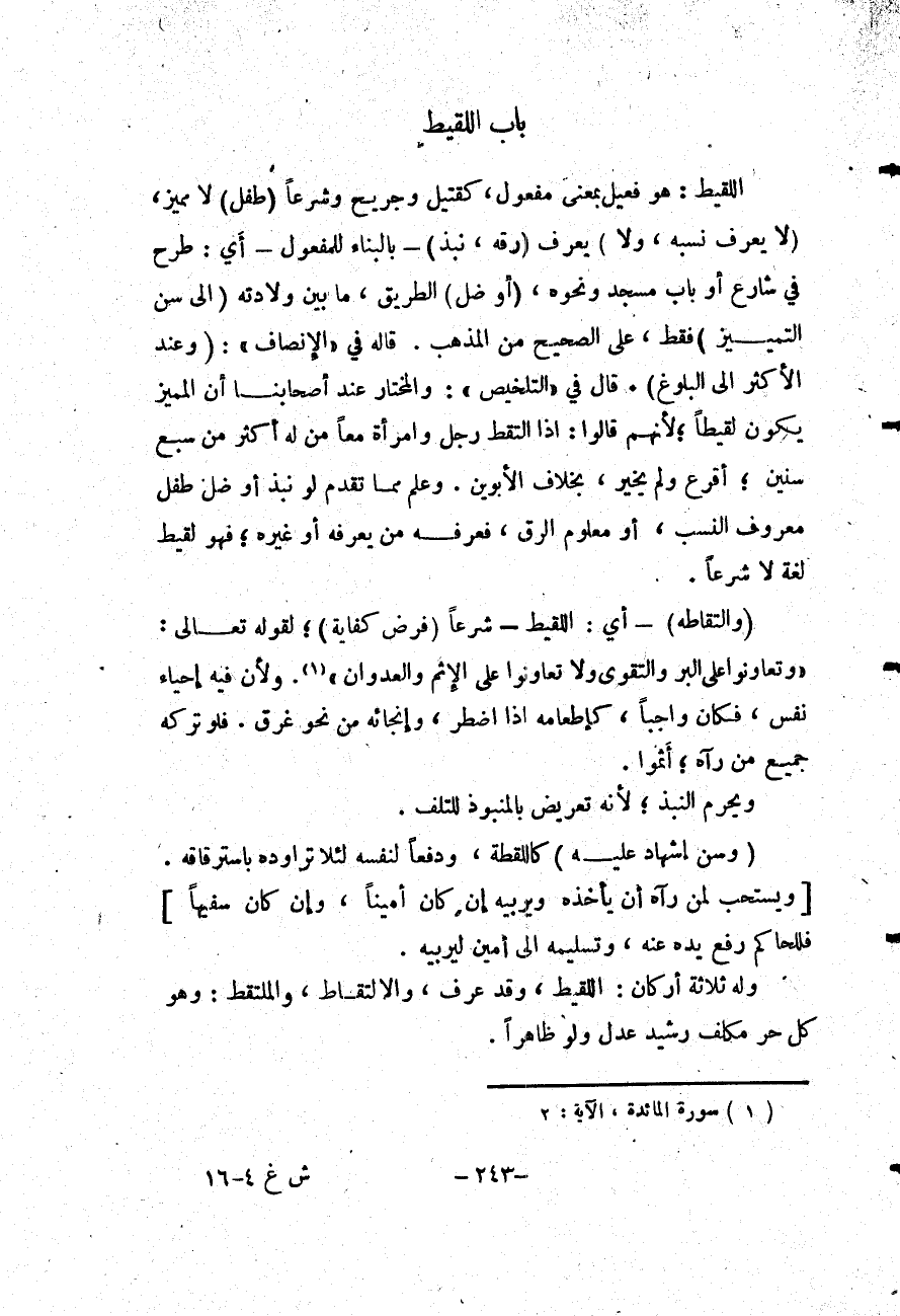 (وَالْتِقَاطُهُ) - أَيْ: اللَّقِيطِ - شَرْعًا (فَرْضُ كِفَايَةٍ) ؛ لِقَوْلِهِ تَعَالَى: {وَتَعَاوَنُوا عَلَى الْبِرِّ وَالتَّقْوَى وَلا تَعَاوَنُوا عَلَى الإِثْمِ وَالْعُدْوَانِ} [المائدة: 2] وَلِأَنَّ فِيهِ إحْيَاءَ نَفْسٍ، فَكَانَ وَاجِبًا، كَإِطْعَامِهِ إذَا اُضْطُرَّ، وَإِنْجَائِهِ مِنْ نَحْوِ غَرَقٍ. فَلَوْ تَرَكَهُ جَمِيعُ مَنْ رَآهُ؛ أَثِمُوا. وَيَحْرُمُ النَّبْذُ؛ لِأَنَّهُ تَعْرِيضٌ بِالْمَنْبُوذِ لِلتَّلَفِ.