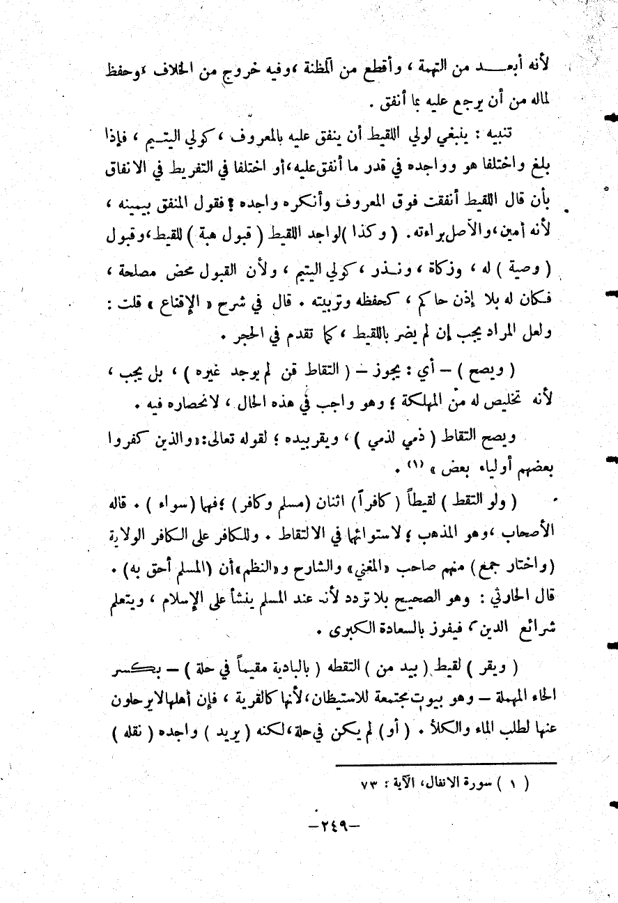وَيَصِحُّ الْتِقَاطُ (ذِمِّيٍّ لِذِمِّيٍّ) ، وَيُقَرُّ بِيَدِهِ، لِقَوْلِهِ تَعَالَى: {وَالَّذِينَ كَفَرُوا بَعْضُهُمْ أَوْلِيَاءُ بَعْضٍ} [الأنفال: 73] .