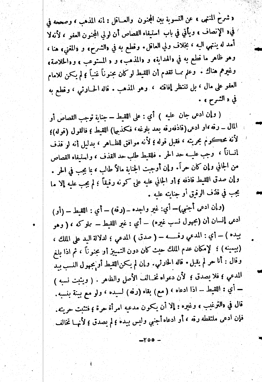 (وَإِنْ ادَّعَى جَانٍ عَلَيْهِ) أَيْ: عَلَى اللَّقِيطِ - جِنَايَةً تُوجِبُ الْقِصَاصَ أَوْ الْمَالَ - رِقَّهُ، أَوْ ادَّعَى (قَاذِفُهُ رِقَّهُ بَعْدَ بُلُوغِهِ، فَكَذَّبَهُمَا) اللَّقِيطُ؛ فَالْقَوْلُ (قَوْلُهُ) ؛ لِأَنَّهُ مَحْكُومٌ بِحُرِّيَّتِهِ، فَقُبِلَ قَوْلُهُ؛ لِأَنَّهُ مُوَافِقٌ لِلظَّاهِرِ، بِدَلِيلِ أَنَّهُ لَوْ قَذَفَ إنْسَانًا، وَجَبَ عَلَيْهِ حَدُّ الْحُرِّ.