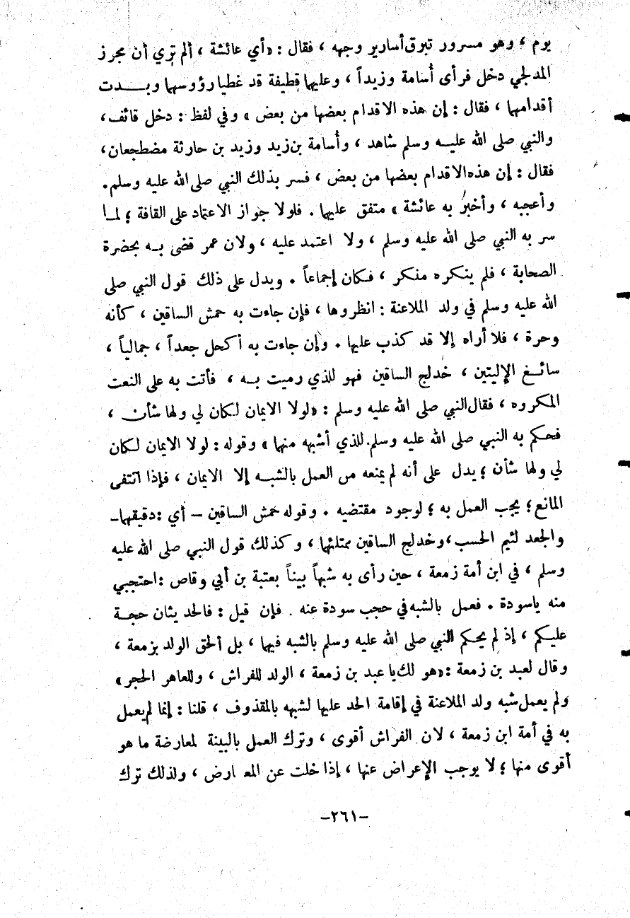 يَوْمٍ، وَهُوَ مَسْرُورٌ تَبْرُقُ أَسَارِيرُ وَجْهِهِ، فَقَالَ: أَيْ عَائِشَةُ، أَلَم تَرَيْ أَنَّ مُجَزِّزًا الْمُدْلِجِيَّ دَخَلَ فَرَأَى أُسَامَةَ وَزَيْدًا، وَعَلَيْهِمَا قَطِيفَةٌ قَدْ غَطَّيَا رُءُوسَهُمَا وَبَدَتْ أَقْدَامُهُمَا، فَقَالَ: إنَّ هَذِهِ الْأَقْدَامَ بَعْضُهَا مِنْ بَعْضٍ» وَفِي لَفْظٍ: «دَخَلَ قَائِفٌ، وَالنَّبِيُّ - صَلَّى اللَّهُ عَلَيْهِ وَسَلَّمَ - شَاهِدٌ، وَأُسَامَةُ بْنُ زَيْدٍ وَزَيْدُ بْنُ حَارِثَةَ مُضْطَجِعَانِ، فَقَالَ: إنَّ هَذِهِ الْأَقْدَامَ بَعْضُهَا مِنْ بَعْضٍ، فَسُرَّ بِذَلِكَ النَّبِيُّ - صَلَّى اللَّهُ عَلَيْهِ وَسَلَّمَ - وَأَعْجَبَهُ، وَأَخْبَرَ بِهِ عَائِشَةَ» مُتَّفَقٌ عَلَيْهِمَا.