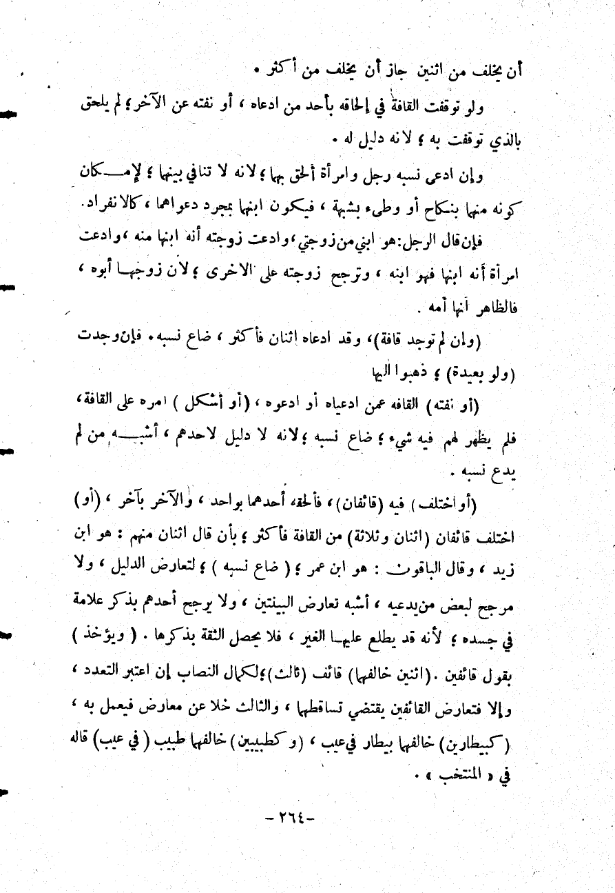 (أَوْ اخْتَلَفَ) فِيهِ (قَائِفَانِ) ، فَأَلْحَقَهُ أَحَدُهُمَا بِوَاحِدٍ، وَالْآخَرُ بِآخَرَ، (أَوْ) اخْتَلَفَ قَائِفَانِ (اثْنَانِ وَثَلَاثَةٌ) مِنْ الْقَافَةِ فَأَكْثَرَ؛ بِأَنْ قَالَ اثْنَانِ مِنْهُمْ: هُوَ ابْنُ زَيْدٍ، وَقَالَ الْبَاقُونَ: هُوَ ابْنُ عُمَرَ؛ (ضَاعَ نَسَبُهُ) ؛ لِتَعَارُضِ الدَّلِيلِ، وَلَا مُرَجِّحَ لِبَعْضِ مَنْ يَدَّعِيهِ، أَشْبَهَ تَعَارُضَ الْبَيِّنَتَيْنِ، وَلَا يُرَجَّحُ أَحَدُهُمْ بِذِكْرِ عَلَامَةٍ فِي جَسَدِهِ؛ لِأَنَّهُ قَدْ يَطَّلِعُ عَلَيْهَا الْغَيْرُ، فَلَا يَحْصُلُ الثِّقَةُ بِذِكْرِهَا.