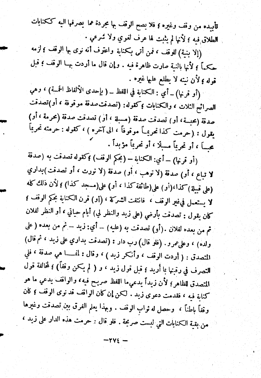 (أَوْ قَرَنَهَا) - أَيْ: الْكِنَايَةَ - (بِحُكْمِ الْوَقْفِ) ؛ كَقَوْلِهِ: تَصَدَّقْتُ بِهِ (صَدَقَةً لَا تُبَاعُ، أَوْ) صَدَقَةً (لَا تُوهَبُ، أَوْ) صَدَقَةً (لَا تُورَثُ، أَوْ تَصَدَّقْتُ) بِدَارِي (عَلَى قَبِيلَةِ) كَذَا، (أَوْ) عَلَى (طَائِفَةِ كَذَا، أَوْ) عَلَى (مَسْجِدِ كَذَا) ؛ لِأَنَّ ذَلِكَ كُلَّهُ لَا يُسْتَعْمَلُ فِي غَيْرِ الْوَقْفِ، فَانْتَفَتْ الشَّرِكَةُ، (أَوْ) قَرَنَ الْكِنَايَةَ بِحُكْمِ الْوَقْفِ؛ كَأَنْ يَقُولَ: تَصَدَّقْتُ بِأَرْضِي (عَلَى زَيْدٍ وَالنَّظَرُ لِي) أَيَّامَ حَيَاتِي، أَوْ النَّظَرُ لِفُلَانٍ ثُمَّ مِنْ بَعْدِهِ لِفُلَانٍ.