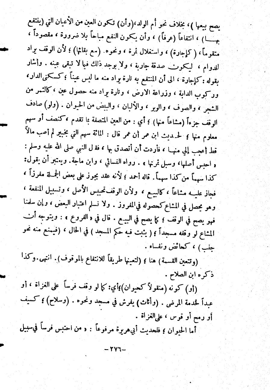 وَأَشَارَ بِقَوْلِهِ: كَإِجَارَةٍ، إلَى أَنَّ الْمُنْتَفَعَ بِهِ تَارَةً يُرَادُ مِنْهُ مَا لَيْسَ عَيْنًا؛ كَسُكْنَى الدَّارِ، وَرُكُوبِ الدَّابَّةِ، وَزِرَاعَةِ الْأَرْضِ، وَتَارَةً يُرَادُ مِنْهُ حُصُولُ عَيْنٍ، كَالثَّمَرِ مِنْ الشَّجَرِ، وَالصُّوفِ، وَالْوَبَرِ، وَالْأَلْبَانِ، وَالْبَيْضِ مِنْ الْحَيَوَانِ. (وَلَوْ) صَادَفَ الْوَقْفُ جُزْءًا (مُشَاعًا مِنْهَا) ؛ أَيْ: مِنْ الْعَيْنِ الْمُتَّصِفَةِ بِمَا تَقَدَّمَ، كَنِصْفٍ أَوْ سَهْمٍ مَعْلُومٍ مِنْهَا؛ لِحَدِيثِ ابْنِ عُمَرَ «أَنَّ عُمَرَ قَالَ: الْمِائَةُ سَهْمٍ الَّتِي بِخَيْبَرَ لَمْ أُصِبْ مَالًا قَطُّ أَعْجَبَ إلَيَّ مِنْهَا، فَأَرَدْتُ أَنْ أَتَصَدَّقَ بِهَا، فَقَالَ النَّبِيُّ - صَلَّى اللَّهُ عَلَيْهِ وَسَلَّمَ -: احْبِسْ أَصْلَهَا، وَسَبِّلْ ثَمَرَتَهَا» . رَوَاهُ النَّسَائِيّ، وَابْنُ مَاجَهْ.