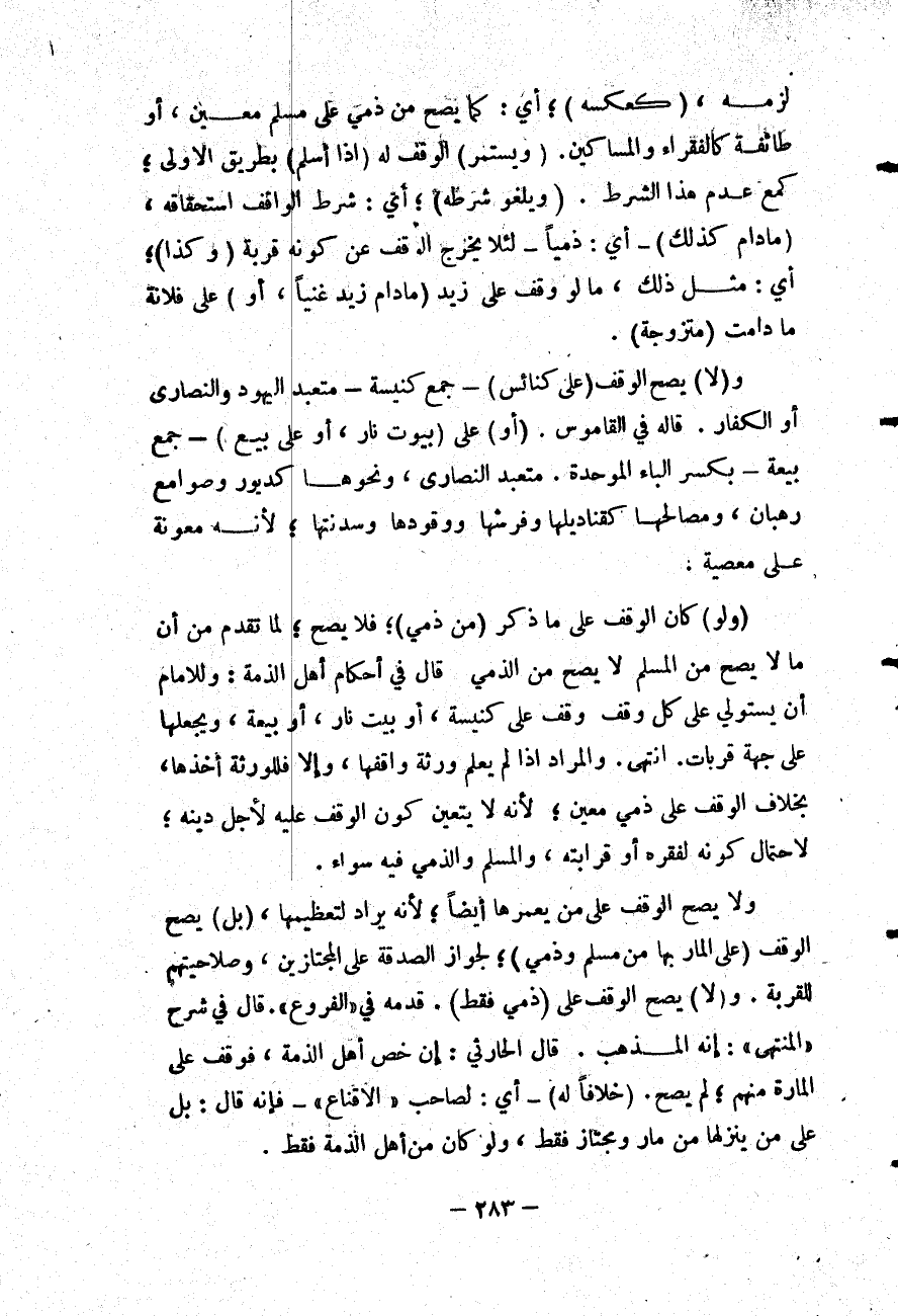 قَالَ الْحَارِثِيُّ: إنْ خَصَّ أَهْلَ الذِّمَّةِ، فَوَقَفَ عَلَى الْمَارَّةِ مِنْهُمْ؛ لَمْ يَصِحَّ. (خِلَافًا لَهُ) - أَيْ: لِصَاحِبِ الْإِقْنَاعِ " - فَإِنَّهُ قَالَ: بَلْ عَلَى مَنْ يَنْزِلُهَا مِنْ مَارٍّ وَمُجْتَازٍ فَقَطْ، وَلَوْ كَانَ مِنْ أَهْلِ الذِّمَّةِ فَقَطْ.