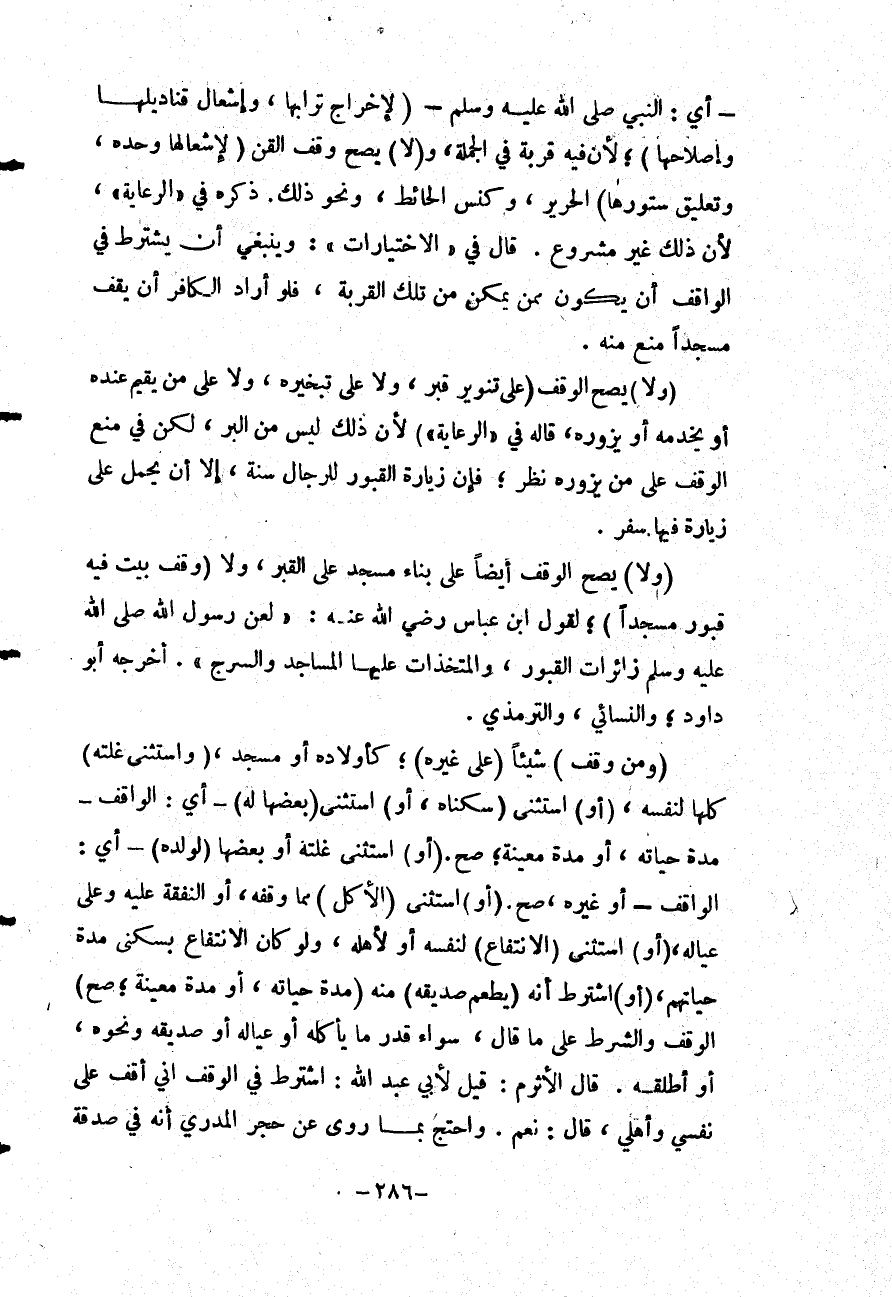 (وَلَا) يَصِحُّ الْوَقْفُ (عَلَى تَنْوِيرِ قَبْرٍ، وَلَا عَلَى تَبْخِيرِهِ، وَلَا عَلَى مَنْ يُقِيمُ عِنْدَهُ أَوْ يَخْدُمُهُ أَوْ يَزُورُهُ، قَالَهُ فِي الرِّعَايَةِ ") لِأَنَّ ذَلِكَ لَيْسَ مِنْ الْبِرِّ، لَكِنْ فِي مَنْعِ الْوَقْفِ عَلَى مَنْ يَزُورُهُ نَظَرٌ؛ فَإِنَّ زِيَارَةَ الْقُبُورِ لِلرِّجَالِ سُنَّةٌ، إلَّا أَنْ يُحْمَلَ عَلَى زِيَارَةٍ فِيهَا سَفَرٌ.