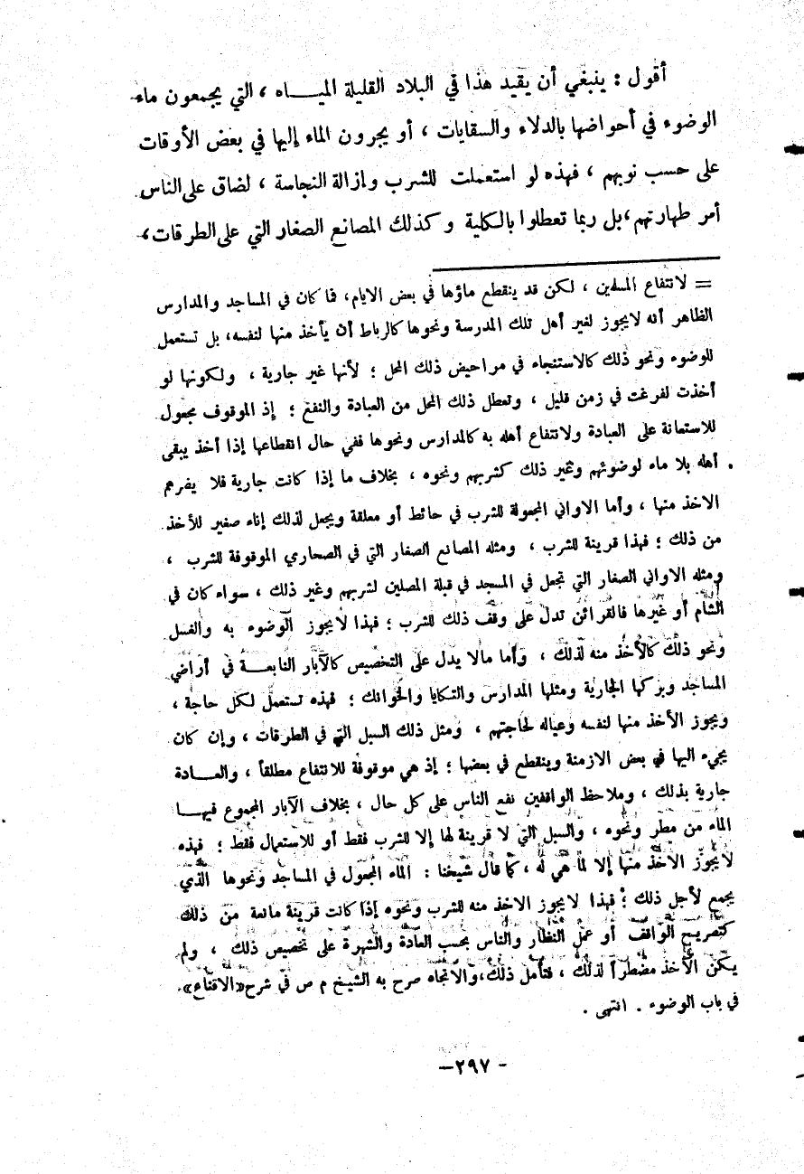 أَقُولُ: يَنْبَغِي أَنْ يُقَيَّدَ هَذَا فِي الْبِلَادِ الْقَلِيلَةِ الْمِيَاهِ، الَّتِي يَجْمَعُونَ مَاءَ الْوُضُوءِ فِي أَحْوَاضِهَا بِالدِّلَاءِ وَالسِّقَايَاتِ، أَوْ يَجُرُّونَ الْمَاءَ إلَيْهَا فِي بَعْضِ الْأَوْقَاتِ عَلَى حَسَبِ نَوْبِهِمْ، فَهَذِهِ لَوْ اُسْتُعْمِلَتْ لِلشُّرْبِ وَإِزَالَةِ النَّجَاسَةِ، لَضَاقَ عَلَى النَّاسِ أَمْرُ طَهَارَتِهِمْ، بَلْ رُبَّمَا تَعَطَّلُوا بِالْكُلِّيَّةِ وَكَذَلِكَ الْمَصَانِعُ الصِّغَارُ الَّتِي عَلَى الطُّرُقَاتِ،