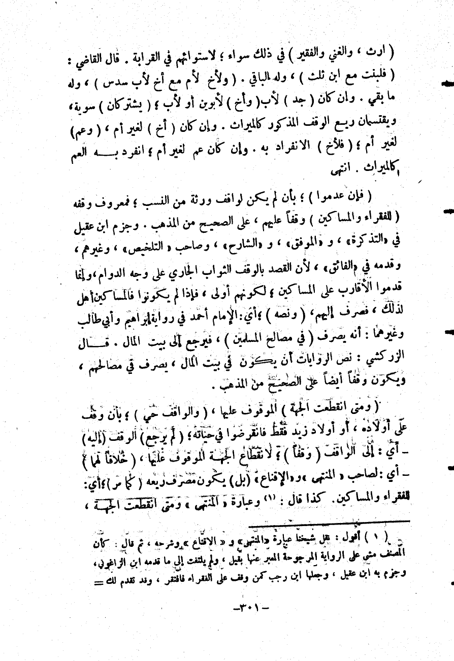 (فَإِنْ عَدِمُوا) ؛ بِأَنْ لَمْ يَكُنْ لِوَاقِفٍ وَرَثَةٌ مِنْ النَّسَبِ؛ فَمَعْرُوفٌ وَقْفُهُ (لِلْفُقَرَاءِ وَالْمَسَاكِينِ) وَقْفًا عَلَيْهِمْ، عَلَى الصَّحِيحِ مِنْ الْمَذْهَبِ.