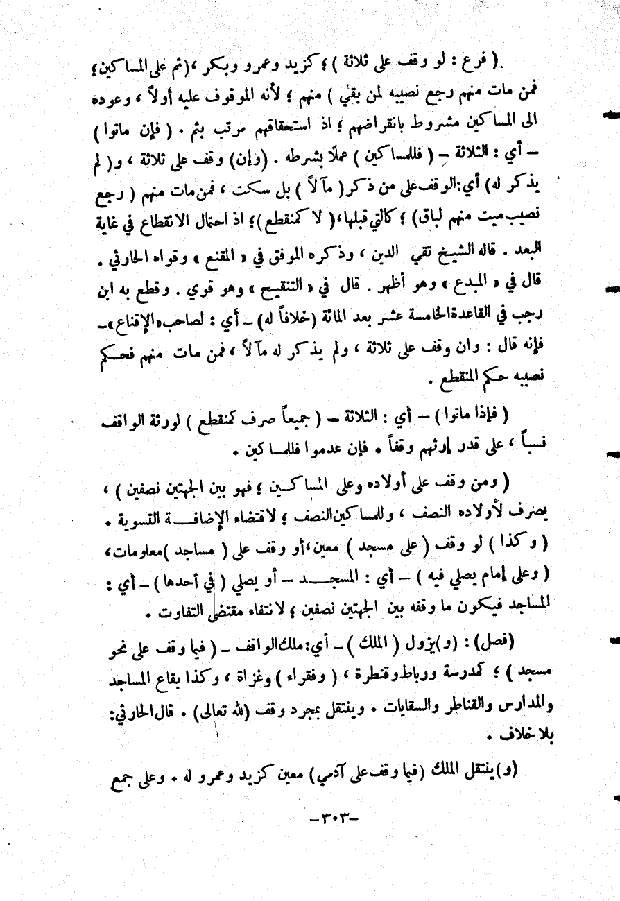 (فَرْعٌ: لَوْ وَقَفَ عَلَى ثَلَاثَةٍ) ؛ كَزَيْدٍ وَعَمْرٍو وَبَكْرٍ، (ثُمَّ عَلَى الْمَسَاكِينِ؛ فَمَنْ مَاتَ مِنْهُمْ رَجَعَ نَصِيبَهُ لِمَنْ بَقِيَ) مِنْهُمْ؛ لِأَنَّهُ الْمَوْقُوفُ عَلَيْهِ أَوَّلًا، وَعَوْدُهُ إلَى الْمَسَاكِينِ مَشْرُوطٌ بِانْقِرَاضِهِمْ؛ إذْ اسْتِحْقَاقُهُمْ مُرَتَّبٌ بِثُمَّ.