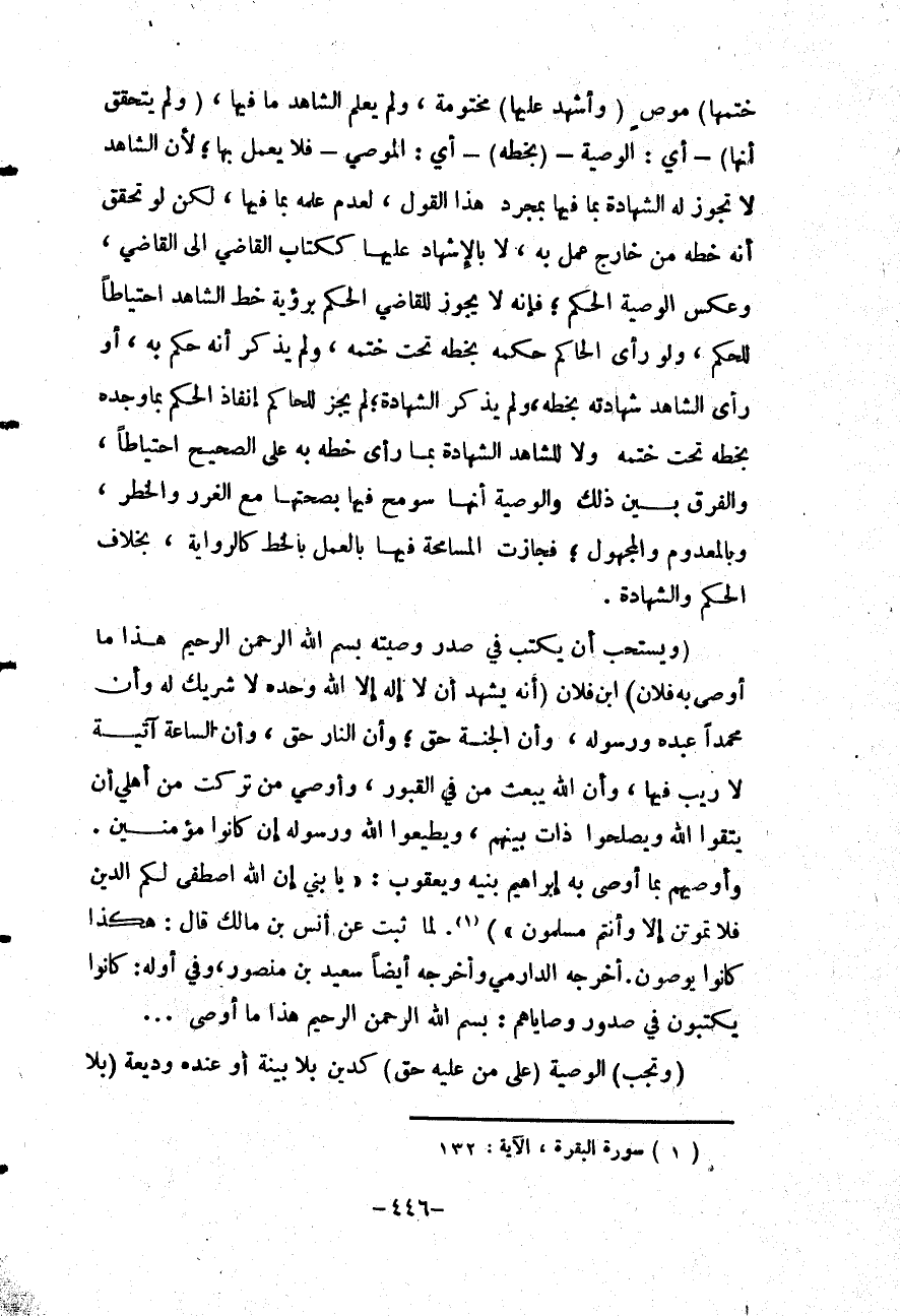 (وَيُسْتَحَبُّ أَنْ يَكْتُبَ فِي صَدْرِ وَصِيَّتِهِ بِسْمِ اللَّهِ الرَّحْمَنِ الرَّحِيمِ هَذَا مَا أَوْصَى بِهِ فُلَانٌ) ابْنُ فُلَانٍ (أَنَّهُ يَشْهَدُ أَنْ لَا إلَهَ إلَّا اللَّهَ وَحْدَهُ لَا شَرِيكَ لَهُ وَأَنَّ مُحَمَّدًا عَبْدُهُ وَرَسُولُهُ، وَأَنَّ الْجَنَّةَ حَقٌّ؛ وَأَنَّ النَّارَ حَقٌّ، وَأَنَّ السَّاعَةَ آتِيَةٌ لَا رَيْبَ فِيهَا، وَأَنَّ اللَّهَ يَبْعَثُ مَنْ فِي الْقُبُورِ، وَأُوصِي مَنْ تَرَكْت مِنْ أَهْلِي أَنْ يَتَّقُوا اللَّهَ وَيُصْلِحُوا ذَاتَ بَيْنِهِمْ، وَيُطِيعُوا اللَّهَ وَرَسُولَهُ إنْ كَانُوا مُؤْمِنِينَ. وَأُوصِيهِمْ بِمَا أَوْصَى بِهِ إبْرَاهِيمُ بَنِيهِ وَيَعْقُوبُ: {يَا بَنِيَّ إِنَّ اللَّهَ اصْطَفَى لَكُمُ الدِّينَ فَلا تَمُوتُنَّ إِلا وَأَنْتُمْ مُسْلِمُونَ} [البقرة: 132] . لِمَا ثَبَتَ عَنْ أَنَسِ بْنِ مَالِكٍ قَالَ: هَكَذَا كَانُوا يُوصُونَ. أَخْرَجَهُ الدَّارِمِيُّ وَأَخْرَجَهُ أَيْضًا سَعِيدُ بْنُ مَنْصُورٍ، وَفِي أَوَّلِهِ: كَانُوا يَكْتُبُونَ فِي صُدُورِ وَصَايَاهُمْ: بِسْمِ اللَّهِ الرَّحْمَنِ الرَّحِيمِ هَذَا مَا أَوْصَى.