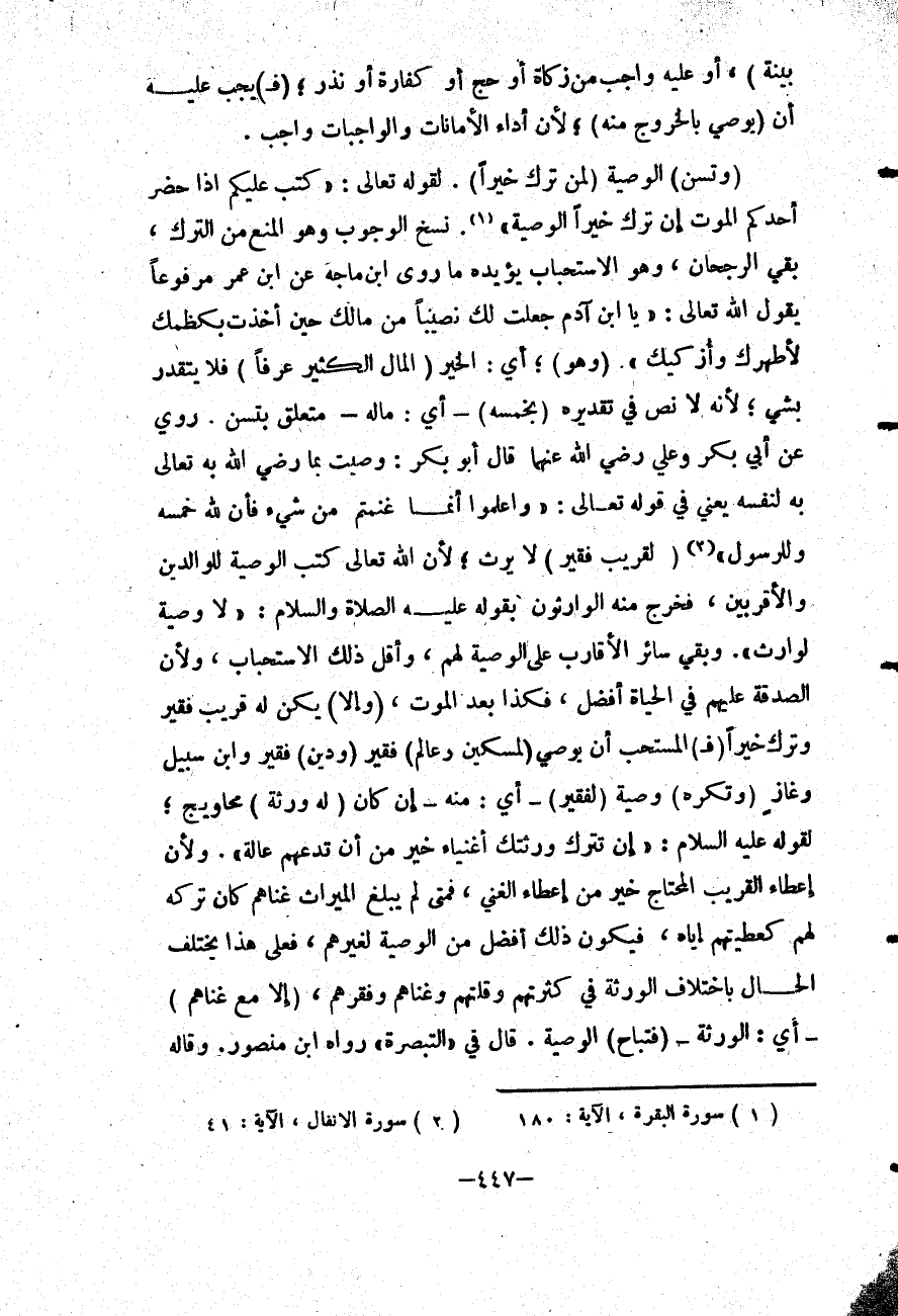 (وَتُسَنُّ) الْوَصِيَّةُ (لِمَنْ تَرَكَ خَيْرًا) . لِقَوْلِهِ تَعَالَى: {كُتِبَ عَلَيْكُمْ إِذَا حَضَرَ أَحَدَكُمُ الْمَوْتُ إِنْ تَرَكَ خَيْرًا الْوَصِيَّةُ} [البقرة: 180] . نَسَخَ الْوُجُوبَ وَهُوَ الْمَنْعُ مِنْ التَّرْكِ، بَقِيَ الرُّجْحَانُ، وَهُوَ الِاسْتِحْبَابُ يُؤَيِّدُهُ مَا رَوَى ابْنُ مَاجَهْ عَنْ ابْنِ عُمَرَ مَرْفُوعًا يَقُولُ اللَّهُ تَعَالَى: {يَا ابْنَ آدَمَ جَعَلْتُ لَك نَصِيبًا مِنْ مَالِك حِينَ أَخَذْتَ بِكَظْمِكَ لِأُطَهِّرَك وَأُزَكِّيَك} .