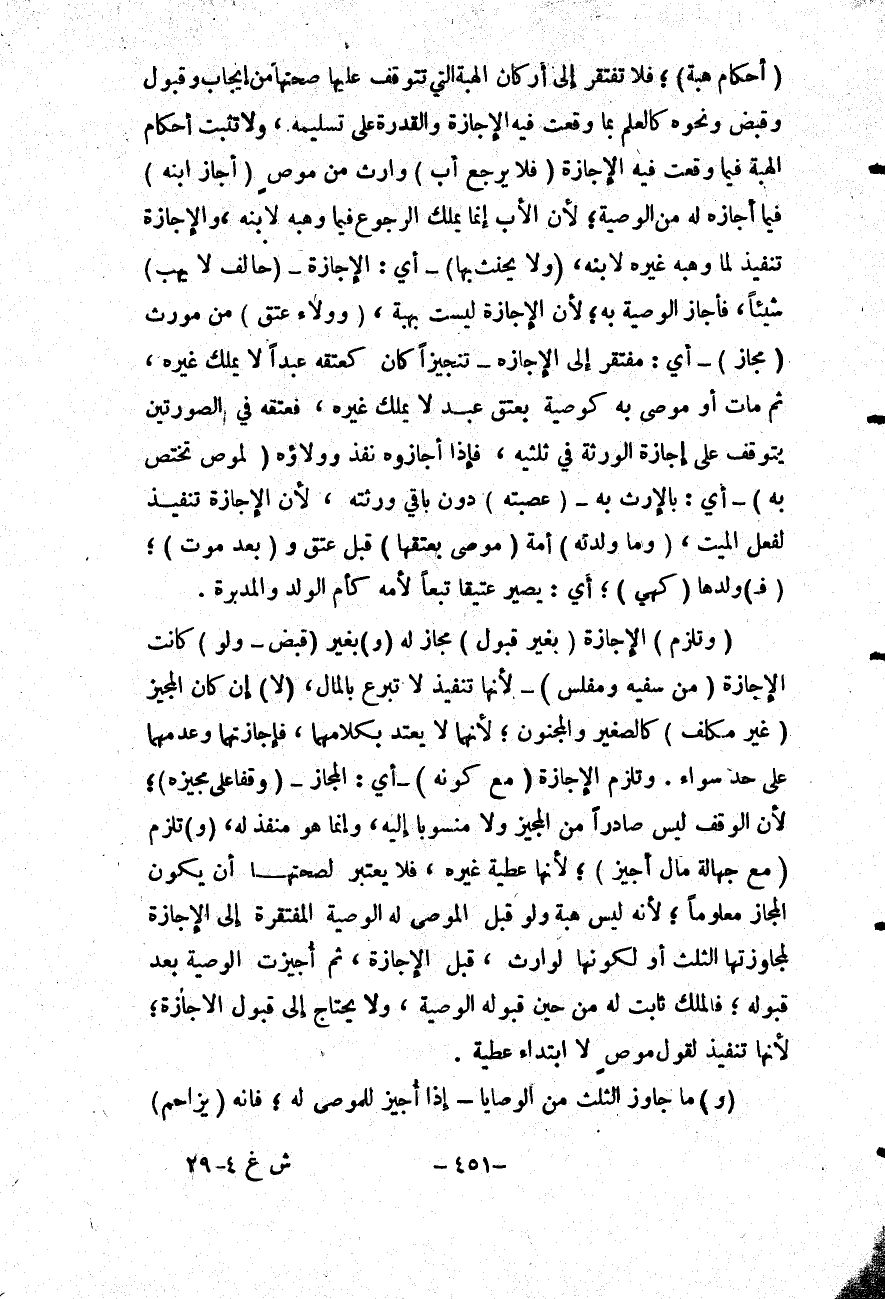 (أَحْكَامُ هِبَةٍ) فَلَا تَفْتَقِرُ إلَى أَرْكَانِ الْهِبَةِ الَّتِي تَتَوَقَّفُ عَلَيْهَا صِحَّتُهَا مِنْ إيجَابٍ وَقَبُولٍ وَقَبْضٍ وَنَحْوِهِ كَالْعِلْمِ بِمَا وَقَعَتْ فِيهِ الْإِجَازَةُ وَالْقُدْرَةِ عَلَى تَسْلِيمِهِ.