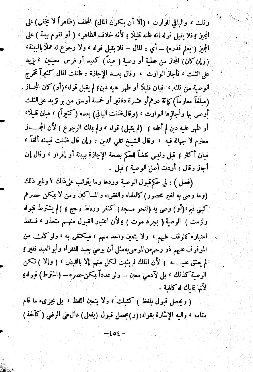 (فَصْلٌ) فِي حُكْمِ قَبُولِ الْوَصِيَّةِ وَرَدِّهَا وَمَا يَتَرَتَّبُ عَلَى ذَلِكَ، وَغَيْرِ ذَلِكَ (وَمَا وَصَّى بِهِ لِغَيْرِ مَحْصُورٍ) كَالْعُلَمَاءِ وَالْفُقَرَاءِ وَالْمَسَاكِينِ وَمَنْ لَا يُمْكِنُ حَصْرُهُمْ كَبَنِي تَمِيمٍ (أَوْ) وَصَّى بِهِ (لِنَحْوِ مَسْجِدٍ) كَثَغْرٍ وَرِبَاطٍ وَحَجٍّ (لَمْ يُشْتَرَطْ قَبُولُهُ وَلَزِمَتْ) الْوَصِيَّةُ (بِمُجَرَّدِ مَوْتٍ) لِأَنَّ اعْتِبَارَ الْقَبُولِ مِنْهُمْ مُتَعَذَّرٌ، فَسَقَطَ اعْتِبَارُهُ كَالْوَقْفِ عَلَيْهِمْ، وَلَا يَتَعَيَّنُ وَاحِدٌ مِنْهُمْ، فَيُكْتَفَى بِهِ، وَلَوْ كَانَ مِنْ الْمَوْقُوفِ عَلَيْهِمْ ذُو رَحِمٍ مِنْ الْمُوصَى بِهِ مِثْلَ أَنْ يُوصِيَ بِعَبْدٍ لِلْفُقَرَاءِ وَأَبُو الْعَبْدِ فَقِيرٌ؛ لَمْ يَعْتِقْ عَلَيْهِ؛ لِأَنَّ الْمِلْكَ لَمْ يَثْبُتْ لِكُلٍّ مِنْهُمْ إلَّا بِالْقَبْضِ (وَإِلَّا) تَكُنْ الْوَصِيَّةُ كَذَلِكَ، بَلْ لِآدَمِيٍّ مُعَيَّنٍ - وَلَوْ عَدَدًا يُمْكِنُ حَصْرُهُ - (اُشْتُرِطَ) قَبُولُهُ؛ لِأَنَّهَا تَمْلِيكٌ لَهُ كَالْهِبَةِ.