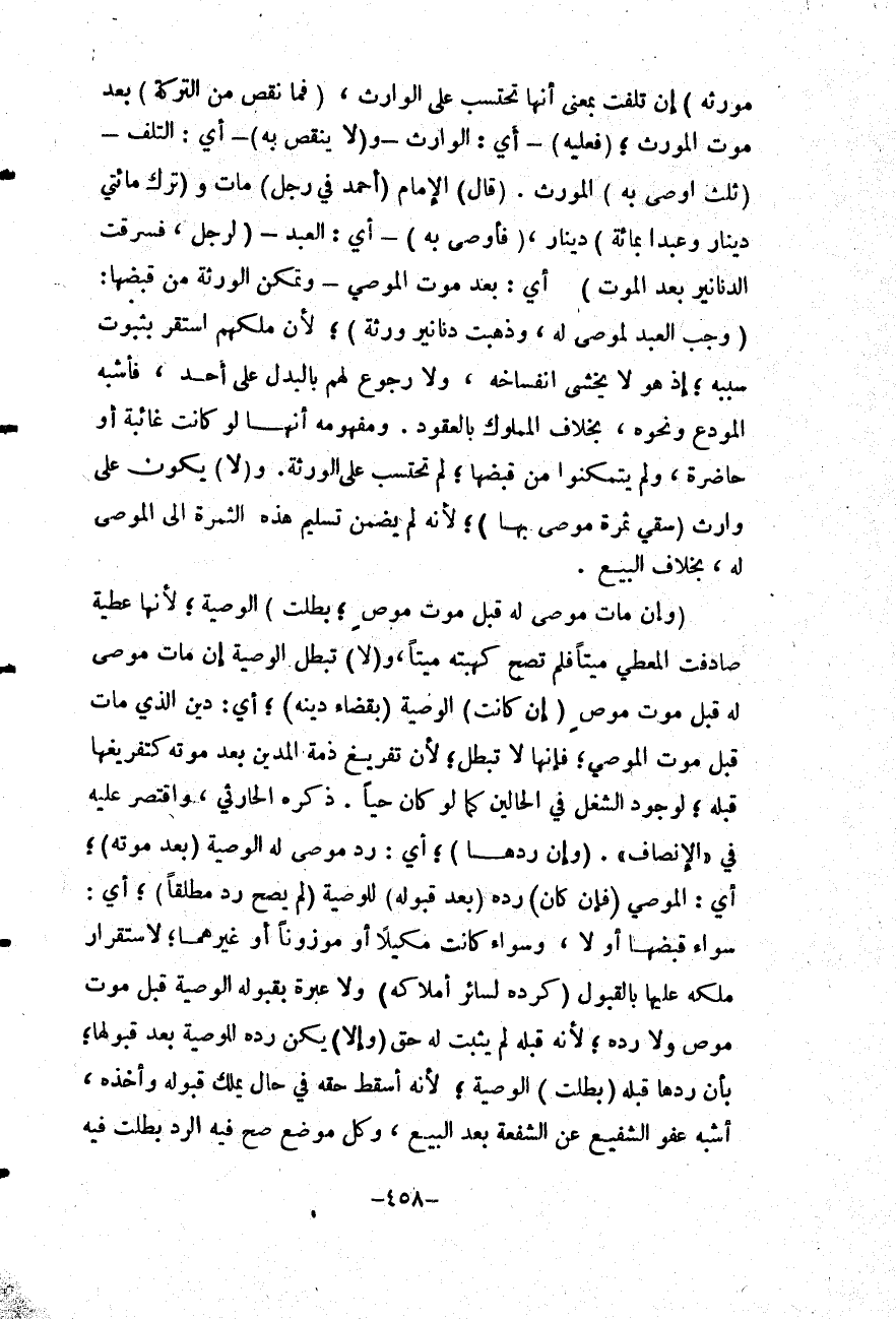 مُوَرِّثِهِ) إنْ تَلِفَتْ بِمَعْنَى أَنَّهَا تُحْتَسَبُ عَلَى الْوَارِثِ (فَمَا نَقَصَ مِنْ التَّرِكَةِ) بَعْدَ مَوْتِ الْمُوَرِّثِ (فَعَلَيْهِ) - أَيْ: الْوَارِثِ - وَ (لَا يَنْقُصُ بِهِ) - أَيْ: التَّلَفِ - (ثُلُثٌ أَوْصَى بِهِ) الْمُوَرِّثُ.