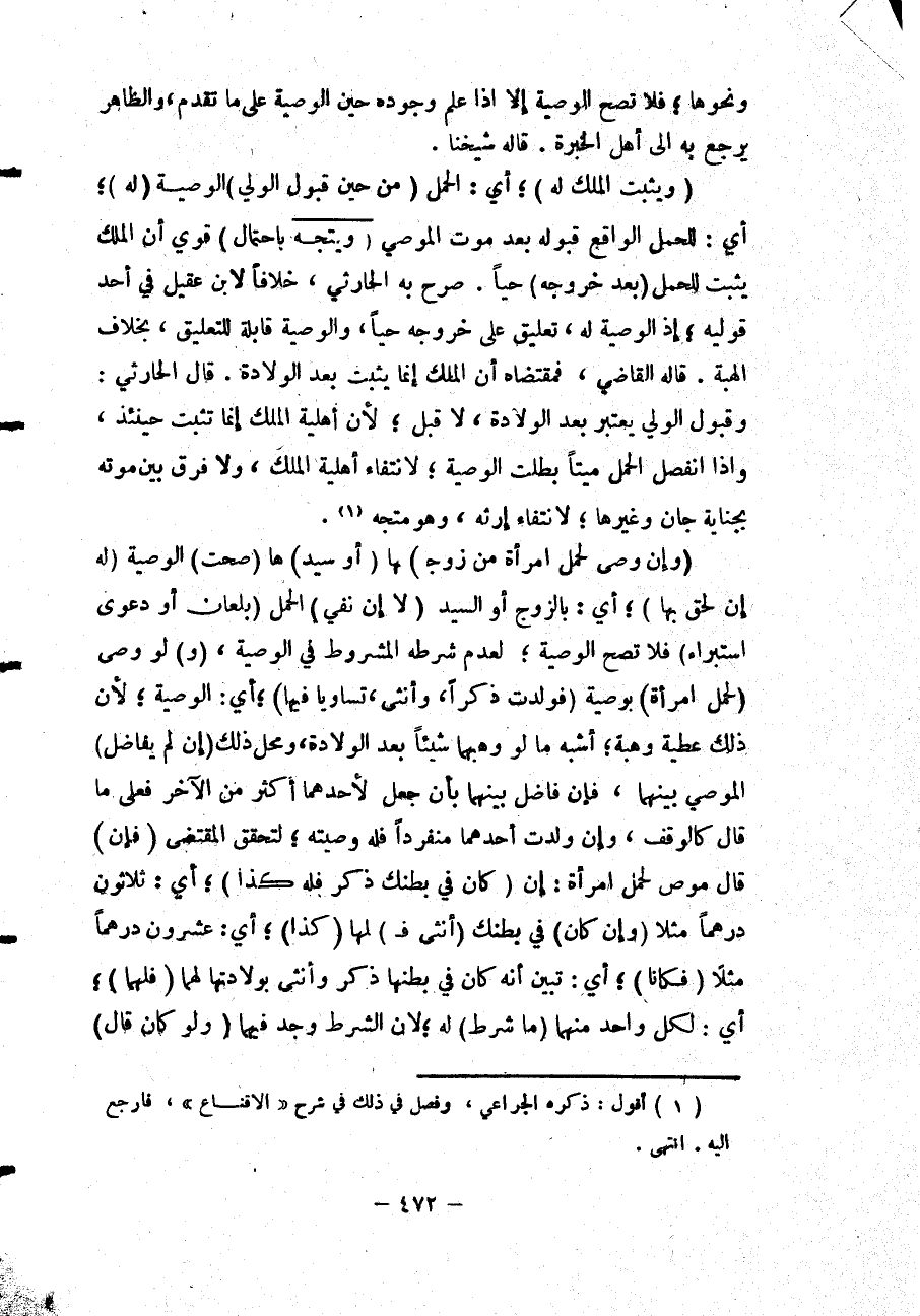 (وَيَثْبُتُ الْمِلْكُ لَهُ) أَيْ: الْحَمْلِ (مِنْ حِينِ قَبُولِ الْوَلِيِّ) الْوَصِيَّةَ (لَهُ) أَيْ: لِلْحَمْلِ الْوَاقِعِ قَبُولُهُ بَعْدَ مَوْتِ الْمُوصِي (وَيَتَّجِهُ بِاحْتِمَالٍ) قَوِيٍّ أَنَّ الْمِلْكَ يَثْبُتُ لِلْحَمْلِ (بَعْدَ خُرُوجِهِ) حَيًّا. صَرَّحَ بِهِ الْحَارِثِيُّ، خِلَافًا لِابْنِ عَقِيلٍ فِي أَحَدِ قَوْلَيْهِ؛ إذْ الْوَصِيَّةُ لَهُ، تَعْلِيقٌ عَلَى خُرُوجِهِ حَيًّا، وَالْوَصِيَّةُ قَابِلَةٌ لِلتَّعْلِيقِ، بِخِلَافِ الْهِبَةِ. قَالَهُ الْقَاضِي، فَمُقْتَضَاهُ أَنَّ الْمِلْكَ إنَّمَا يَثْبُتُ بَعْدَ الْوِلَادَةِ. قَالَ الْحَارِثِيُّ: وَقَبُولُ الْوَلِيِّ يُعْتَبَرُ بَعْدَ الْوِلَادَةِ، لَا قَبْلُ؛ لِأَنَّ أَهْلِيَّةَ الْمِلْكِ إنَّمَا تَثْبُتُ حِينَئِذٍ، وَإِذَا انْفَصَلَ الْحَمْلُ مَيِّتًا بَطَلَتْ الْوَصِيَّةُ؛ لِانْتِفَاءِ أَهْلِيَّةِ الْمِلْكِ، وَلَا فَرْقَ بَيْنَ مَوْتِهِ بِجِنَايَةِ جَانٍ وَغَيْرِهَا؛ لِانْتِفَاءِ إرْثِهِ، وَهُوَ مُتَّجِهٌ.