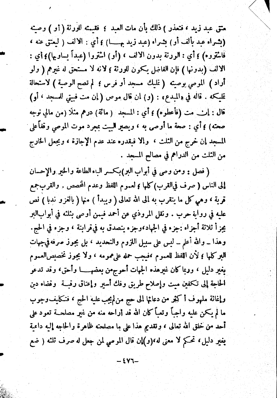 عِتْقَ عَبْدِ زَيْدٍ، فَتَعَذَّرَ) ذَلِكَ بِأَنْ مَاتَ الْعَبْدُ؛ فَقِيمَتُهُ لِلْوَرَثَةِ (أَوْ) وَصِيَّتُهُ (بِشِرَاءِ عَبْدٍ بِأَلْفٍ أَوْ) بِشِرَاءِ (عَبْدِ زَيْدٍ بِهَا) أَيْ: الْأَلْفِ (لِيَعْتِقَ عَنْهُ، فَاشْتَرَوْهُ) أَيْ: الْوَرَثَةُ بِدُونِ الْأَلْفِ (أَوْ) اشْتَرَوْا (عَبْدًا يُسَاوِيهَا) أَيْ: الْأَلْفَ (بِدُونِهَا) فَإِنَّ الْفَاضِلَ يَكُونُ لِلْوَرَثَةِ؛ لِأَنَّهُ لَا مُسْتَحِقَّ لَهُ غَيْرُهُمْ (وَلَوْ أَرَادَ) الْمُوصِي بِوَصِيَّتِهِ (تَمْلِيكَ مَسْجِدٍ أَوْ فَرَسٍ؛ لَمْ تَصِحَّ الْوَصِيَّةُ) لِاسْتِحَالَةِ تَمْلِيكِهِ. قَالَهُ فِي " الْمُبْدِعِ ": (وَ) إنْ قَالَ مُوصٍ (إنْ مِتَّ فَبَيْتِي لِلْمَسْجِدِ، أَوْ) قَالَ: إنْ مِتَّ (فَأَعْطُوهُ) أَيْ: الْمَسْجِدَ (مِائَةَ) دِرْهَمٍ مَثَلًا (مِنْ مَالِي تَوَجَّهَ صِحَّتُهُ) أَيْ: صِحَّةُ مَا أَوْصَى بِهِ، وَيَصِيرُ الْبَيْتُ بِمُجَرَّدِ مَوْتِ الْمُوصِي وَقْفًا عَلَى الْمَسْجِدِ إنْ خَرَجَ مِنْ الثُّلُثِ، وَإِلَّا فَبِقَدْرِهِ عِنْدَ عَدَمِ الْإِجَازَةِ، وَيُجْعَلُ الْخَارِجُ مِنْ الثُّلُثِ مِنْ الدَّرَاهِمِ فِي مَصَالِحِ الْمَسْجِدِ.