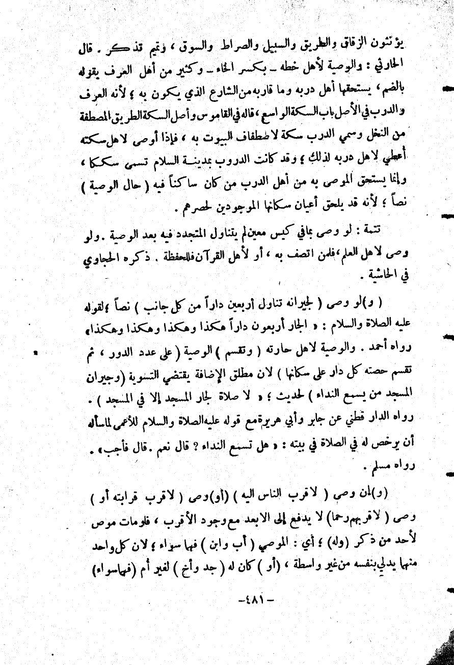 وَالْوَصِيَّةُ لِأَهْلِ حَارَتِهِ (وَتُقَسَّمُ) الْوَصِيَّةُ (عَلَى عَدَدِ الدُّورِ، ثُمَّ تُقَسَّمُ حِصَّةُ كُلِّ دَارٍ عَلَى سُكَّانِهَا) لِأَنَّ مُطْلَقَ الْإِضَافَةِ يَقْتَضِي التَّسْوِيَةَ (وَجِيرَانُ الْمَسْجِدِ مَنْ يَسْمَعُ النِّدَاءَ) لِحَدِيثِ «لَا صَلَاةَ لِجَارِ الْمَسْجِدِ إلَّا فِي الْمَسْجِدِ» . رَوَاهُ الدَّارَقُطْنِيّ عَنْ جَابِرٍ وَأَبِي هُرَيْرَةَ مَعَ قَوْلِهِ - عَلَيْهِ الصَّلَاةُ وَالسَّلَامُ - لِلْأَعْمَى لَمَّا سَأَلَهُ أَنْ يُرَخِّصَ لَهُ فِي الصَّلَاةِ فِي بَيْتِهِ: «هَلْ تَسْمَعُ النِّدَاءَ؟ قَالَ نَعَمْ. قَالَ فَأَجِبْ» . رَوَاهُ مُسْلِمٌ.