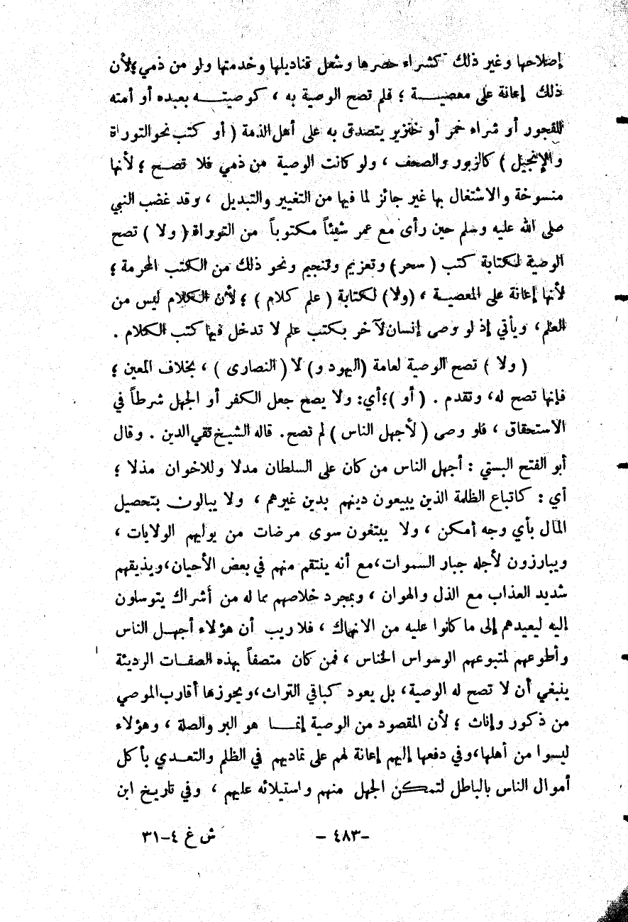 فَلَوْ وَصَّى (لِأَجْهَلِ النَّاسِ) لَمْ تَصِحَّ. قَالَهُ الشَّيْخُ تَقِيُّ الدِّينِ. وَقَالَ أَبُو الْفَتْحِ الْبُسْتِيُّ: أَجْهَلُ النَّاسِ مَنْ كَانَ عَلَى السُّلْطَانِ مُدِلًّا وَلِلْإِخْوَانِ مُذِلًّا؛ أَيْ: كَأَتْبَاعِ الظَّلَمَةِ الَّذِينَ يَبِيعُونَ دِينَهُمْ بِدِينِ غَيْرِهِمْ، وَلَا يُبَالُونَ بِتَحْصِيلِ الْمَالِ بِأَيِّ وَجْهٍ أَمْكَنَ، وَلَا يَبْتَغُونَ سِوَى مَرْضَاةِ مَنْ يُوَلِّيهِمْ الْوِلَايَاتِ، وَيُبَارِزُونَ لِأَجْلِهِ جَبَّارَ السَّمَوَاتِ، مَعَ أَنَّهُ يَنْتَقِمُ مِنْهُمْ فِي بَعْضِ الْأَحْيَانِ، وَيُذِيقُهُمْ شَدِيدَ الْعَذَابِ مَعَ الذُّلِّ وَالْهَوَانِ، وَبِمُجَرَّدِ خَلَاصِهِمْ مِمَّا لَهُ مِنْ أَشْرَاكٍ يَتَوَسَّلُونَ إلَيْهِ لِيُعِيدَهُمْ إلَى مَا كَانُوا عَلَيْهِ مِنْ الِانْهِمَاكِ، فَلَا رَيْبَ أَنَّ هَؤُلَاءِ أَجْهَلُ النَّاسِ وَأَطْوَعُهُمْ لِمَتْبُوعِهِمْ الْوَسْوَاسِ الْخَنَّاسِ، فَمَنْ كَانَ مُتَّصِفًا بِهَذِهِ الصِّفَاتِ الرَّدِيئَةِ يَنْبَغِي أَنْ لَا تَصِحَّ لَهُ الْوَصِيَّةُ، بَلْ يَعُودُ كَبَاقِي التُّرَاثِ، وَيَحُوزُهَا أَقَارِبُ الْمُوصِي مِنْ ذُكُورٍ وَإِنَاثٍ؛ لِأَنَّ الْمَقْصُودَ مِنْ الْوَصِيَّةِ إنَّمَا هُوَ الْبِرُّ وَالصِّلَةُ، وَهَؤُلَاءِ لَيْسُوا مِنْ أَهْلِهَا، وَفِي دَفْعِهَا إلَيْهِمْ إعَانَةٌ لَهُمْ عَلَى تَمَادِيهِمْ فِي الظُّلْمِ وَالتَّعَدِّي بِأَكْلِ أَمْوَالِ النَّاسِ بِالْبَاطِلِ لِتَمَكُّنِ الْجَهْلِ مِنْهُمْ وَاسْتِيلَائِهِ عَلَيْهِمْ، وَفِي تَارِيخِ ابْنِ النَّجَّارِ