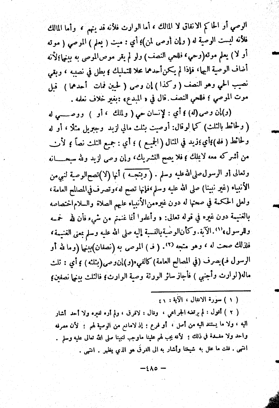(وَيَتَّجِهُ) أَنَّهَا (لَا) تَصِحُّ الْوَصِيَّةُ لِنَبِيٍّ مِنْ الْأَنْبِيَاءِ (غَيْرِ نَبِيِّنَا) - صَلَّى اللَّهُ عَلَيْهِ وَسَلَّمَ - فَإِنَّهَا تَصِحُّ لَهُ، وَتُصْرَفُ فِي الْمَصَالِحِ الْعَامَّةِ، وَلَعَلَّ الْحِكْمَةَ فِي صِحَّتِهَا لَهُ دُونَ غَيْرِهِ مِنْ الْأَنْبِيَاءِ - عَلَيْهِمْ الصَّلَاةُ وَالسَّلَامُ - اخْتِصَاصُهُ بِالْغَنِيمَةِ دُونَ غَيْرِهِ فِي قَوْله تَعَالَى: {وَاعْلَمُوا أَنَّمَا غَنِمْتُمْ مِنْ شَيْءٍ فَأَنَّ لِلَّهِ خُمُسَهُ وَلِلرَّسُولِ} [الأنفال: 41] . الْآيَةَ. وَكَأَنَّ الْوَصِيَّةَ بِالنِّسْبَةِ إلَيْهِ - صَلَّى اللَّهُ عَلَيْهِ وَسَلَّمَ - بِمَعْنَى الْغَنِيمَةِ، فَلِذَلِكَ صَحَّتْ لَهُ، وَهُوَ مُتَّجِهٌ.