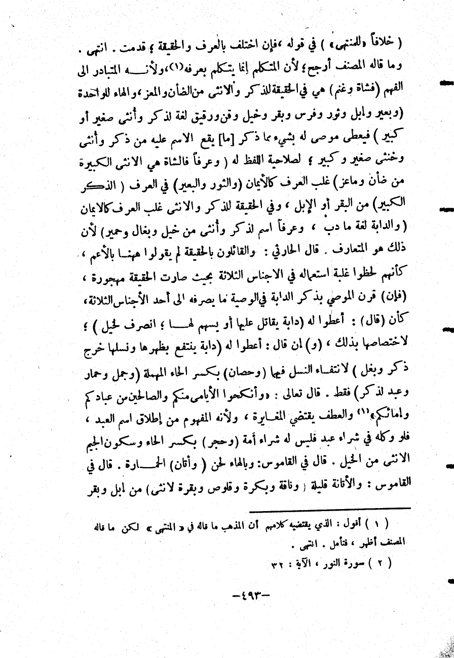 (خِلَافًا " لِلْمُنْتَهَى ") فِي قَوْلِهِ؛ فَإِنْ اخْتَلَفَ بِالْعُرْفِ وَالْحَقِيقَةِ؛ قُدِّمَتْ. انْتَهَى. وَمَا قَالَهُ الْمُصَنِّفُ أَرْجَحُ؛ لِأَنَّ الْمُتَكَلِّمَ إنَّمَا يَتَكَلَّمُ بِعُرْفِهِ، وَلِأَنَّهُ الْمُتَبَادَرُ إلَى الْفَهْمِ (فَشَاةٌ وَغَنَمٌ) هِيَ فِي الْحَقِيقَةِ لِلذَّكَرِ وَالْأُنْثَى مِنْ الضَّأْنِ وَالْمَعْزِ، وَالْهَاءُ لِلْوَاحِدَةِ (وَبَعِيرٌ وَإِبِلٌ وَثَوْرٌ وَفَرَسٌ وَبَقَرٌ وَخَيْلٌ وَقِنٌّ وَرَقِيقٌ لُغَةً لِذَكَرٍ وَأُنْثَى صَغِيرٍ أَوْ كَبِيرٍ) فَيُعْطَى مُوصَى لَهُ بِشَيْءٍ مِمَّا ذُكِرَ [مَا] يَقَعُ الِاسْمُ عَلَيْهِ مِنْ ذَكَرٍ وَأُنْثَى وَخُنْثَى صَغِيرٍ وَكَبِيرٍ؛ لَصَلَاحِيَّةِ اللَّفْظِ لَهُ (وَعُرْفًا فَالشَّاةُ هِيَ الْأُنْثَى الْكَبِيرَةُ مِنْ ضَأْنٍ وَمَاعِزٍ) غُلِّبَ الْعُرْفُ كَالْأَيْمَانِ (وَالثَّوْرُ وَالْبَعِيرُ) فِي الْعُرْفِ (الذَّكَرُ الْكَبِيرُ) مِنْ الْبَقَرِ أَوْ الْإِبِلِ، وَفِي الْحَقِيقَةِ لِلذَّكَرِ وَالْأُنْثَى غُلِّبَ الْعُرْفُ كَالْأَيْمَانِ (وَالدَّابَّةُ لُغَةً مَا دَبَّ، وَعُرْفًا اسْمٌ لِذَكَرٍ وَأُنْثَى مِنْ خَيْلٍ وَبِغَالٍ وَحَمِيرٍ) لِأَنَّ ذَلِكَ هُوَ الْمُتَعَارَفُ. قَالَ الْحَارِثِيُّ: وَالْقَائِلُونَ بِالْحَقِيقَةِ لَمْ يَقُولُوا هَاهُنَا بِالْأَعَمِّ، كَأَنَّهُمْ لَحَظُوا غَلَبَةَ اسْتِعْمَالِهِ فِي الْأَجْنَاسِ الثَّلَاثَةِ بِحَيْثُ صَارَتْ الْحَقِيقَةُ مَهْجُورَةً.