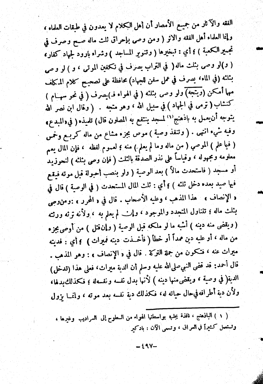 (وَ) لَوْ وَصَّى بِثُلُثِهِ (فِي الْمَاءِ، يُصْرَفُ فِي عَمَلِ سُفُنٍ لِلْجِهَادِ) مُحَافَظَةً عَلَى تَصْحِيحِ كَلَامِ الْمُكَلِّفِ مَهْمَا أَمْكَنَ (وَيَتَّجِهُ) وَلَوْ وَصَّى بِثُلُثِهِ (فِي الْهَوَاءِ فَ) يُصْرَفُ (فِي نَحْوِ سِهَامٍ) كَنُشَّابٍ (تُرْمَى فِي الْجِهَادِ) فِي سَبِيلِ اللَّهِ، وَهُوَ مُتَّجِهٌ. (وَقَالَ ابْنُ نَصْرِ اللَّهِ يَتَوَجَّهُ أَنْ يُعْمَلَ بِهِ باذهنج لِمَسْجِدٍ يَنْتَفِعُ بِهِ الْمُصَلُّونَ قَالَ) تِلْمِيذُهُ (فِي " الْمُبْدِعِ " وَفِيهِ شَيْءٌ) انْتَهَى.