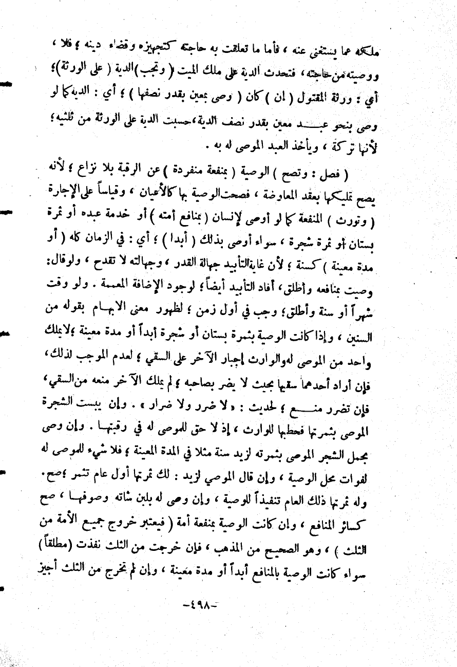 (فَصْلٌ: وَتَصِحُّ) الْوَصِيَّةُ (بِمَنْفَعَةٍ مُنْفَرِدَةٍ) عَنْ الرَّقَبَةِ بِلَا نِزَاعٍ؛ لِأَنَّهُ يَصِحُّ تَمْلِيكُهَا بِعَقْدِ الْمُعَاوَضَةِ، فَصَحَّتْ الْوَصِيَّةُ بِهَا كَالْأَعْيَانِ، وَقِيَاسًا عَلَى الْإِجَارَةِ (وَتُوَرَّثُ) الْمَنْفَعَةُ كَمَا لَوْ أَوْصَى لِإِنْسَانٍ (بِمَنَافِعِ أَمَتِهِ) أَوْ خِدْمَةِ عَبْدِهِ أَوْ ثَمَرَةِ بُسْتَانٍ أَوْ ثَمَرَةِ شَجَرَةٍ، سَوَاءٌ أَوْصَى بِذَلِكَ (أَبَدًا) ؛ أَيْ: فِي الزَّمَانِ كُلِّهِ (أَوْ مُدَّةً مُعَيَّنَةً) كَسَنَةٍ؛ لِأَنَّ غَايَةَ التَّأْبِيدِ جَهَالَةُ الْقَدْرِ، وَجَهَالَتُهُ لَا تُقْدَحُ، وَلَوْ قَالَ: وَصَّيْتُ بِمَنَافِعِهِ وَأَطْلَقَ، أَفَادَ التَّأْبِيدَ أَيْضًا؛ لِوُجُودِ الْإِضَافَةِ الْمُعَمِّمَةِ. وَلَوْ وَقَّتَ شَهْرًا أَوْ سَنَةً وَأَطْلَقَ؛ وَجَبَ فِي أَوَّلِ زَمَنٍ؛ لِظُهُورِ مَعْنَى الْإِبْهَامِ بِقَوْلِهِ مِنْ السِّنِينَ، وَإِذَا كَانَتْ الْوَصِيَّةُ بِثَمَرَةِ بُسْتَانٍ أَوْ شَجَرَةٍ أَبَدًا أَوْ مُدَّةً مُعَيَّنَةً؛ لَا يَمْلِكُ وَاحِدٌ مِنْ الْمُوصَى لَهُ وَالْوَارِثِ إجْبَارَ الْآخَرِ عَلَى السَّقْيِ؛ لِعَدَمِ الْمُوجِبِ لِذَلِكَ، فَإِنْ أَرَادَ أَحَدُهُمَا سَقْيَهَا بِحَيْثُ لَا يَضُرُّ بِصَاحِبِهِ؛ لَمْ يَمْلِكْ الْآخَرُ مَنْعَهُ مِنْ السَّقْيِ، فَإِنْ تَضَرَّرَ مُنِعَ؛ لِحَدِيثِ: «لَا ضَرَرَ وَلَا ضِرَارَ» .