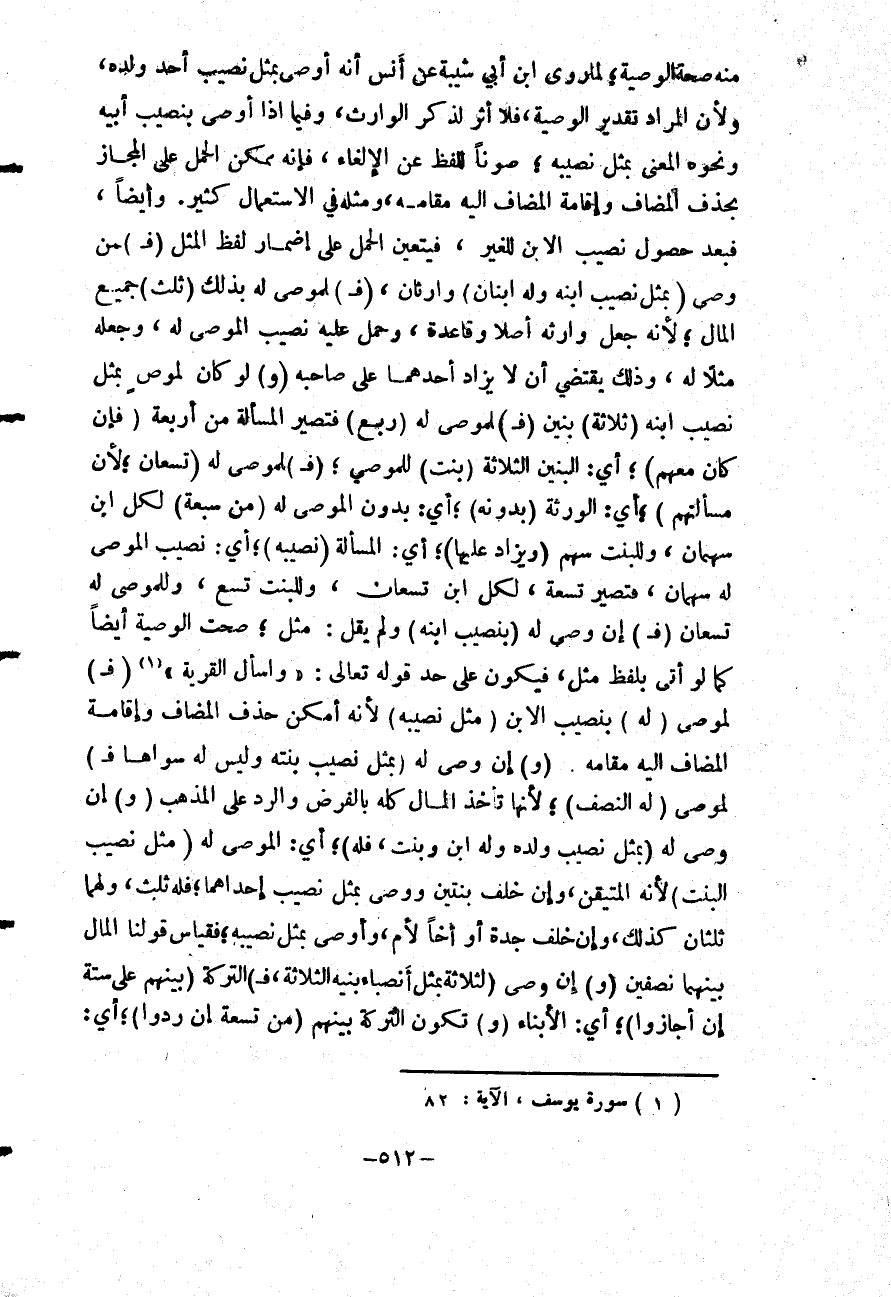 (فَ) إنْ وَصَّى لَهُ (بِنَصِيبِ ابْنِهِ) وَلَمْ يَقُلْ: مِثْلُ؛ صَحَّتْ الْوَصِيَّةُ أَيْضًا كَمَا لَوْ أَتَى بِلَفْظِ مِثْلِ، فَيَكُونُ عَلَى حَدِّ قَوْله تَعَالَى: {وَاسْأَلِ الْقَرْيَةَ} [يوسف: 82] (فَ) لِمُوصَى (لَهُ) بِنَصِيبِ الِابْنِ (مِثْلُ نَصِيبِهِ) لِأَنَّهُ أَمْكَنَ حَذْفُ الْمُضَافِ وَإِقَامَةُ الْمُضَافِ إلَيْهِ مَقَامَهُ.